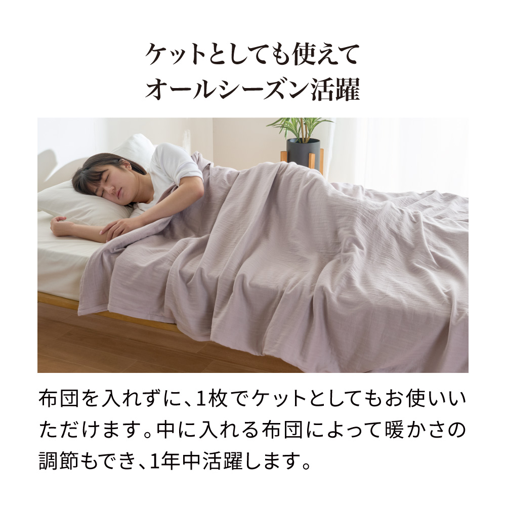 暑い夜は布団を入れずに、1枚でケットとして。肌寒い季節には中に布団を入れて。入れる布団の厚さで暖かさも調節できるから、一年中そばに置いておきたくなる、そんな便利な一枚です。