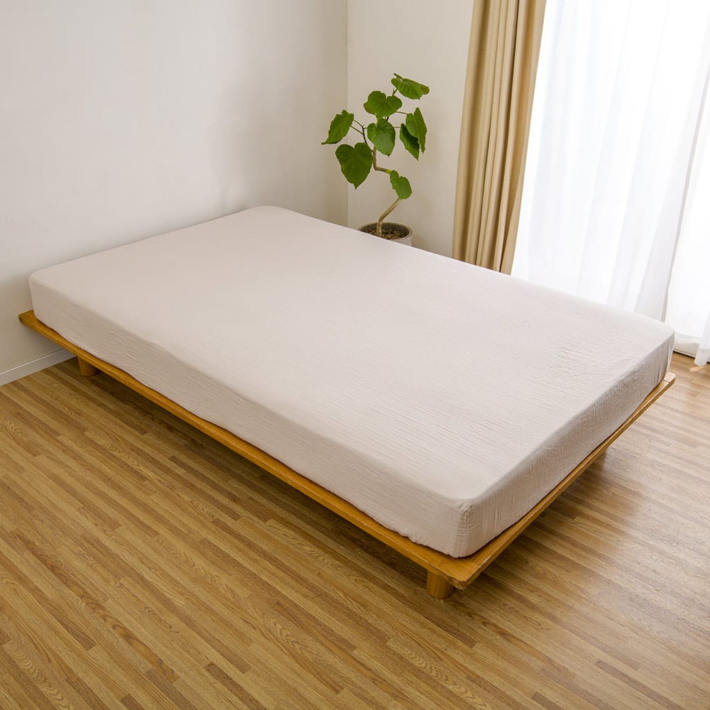 布団にくるまる時、その感触はとても大切。「和ざらし二重ガーゼのボックスシーツ」の素材は、昔ながらの製法で仕上げた綿100%の二重ガーゼ。使えば使うほど、洗えば洗うほど、ほんのりと起毛しながら、ぬくもりのある風合いに育っていき、心まで満たされるやさしい使い心地になっていきます。