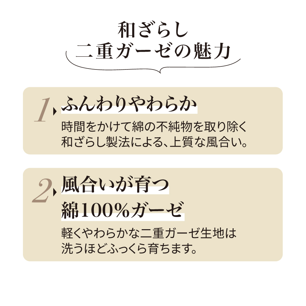 有害な薬品を使用せずにじっくり時間をかけて綿の不純物を取り除く「和ざらし製法」で、生地に負担をかけず上質な風合いに。ヘリンボーン織の二重ガーゼで、やわらかなのにしっかりした生地に仕立てました。