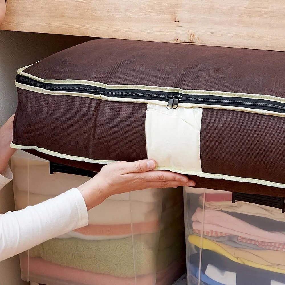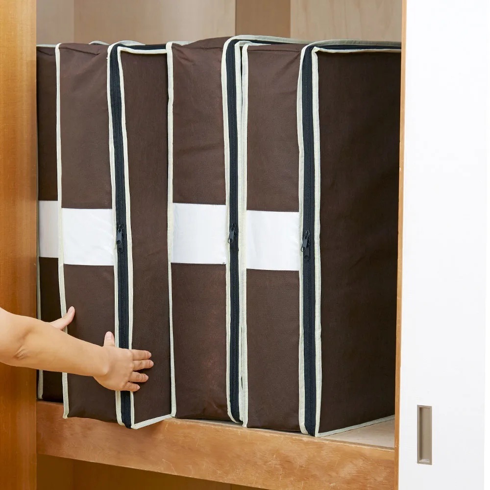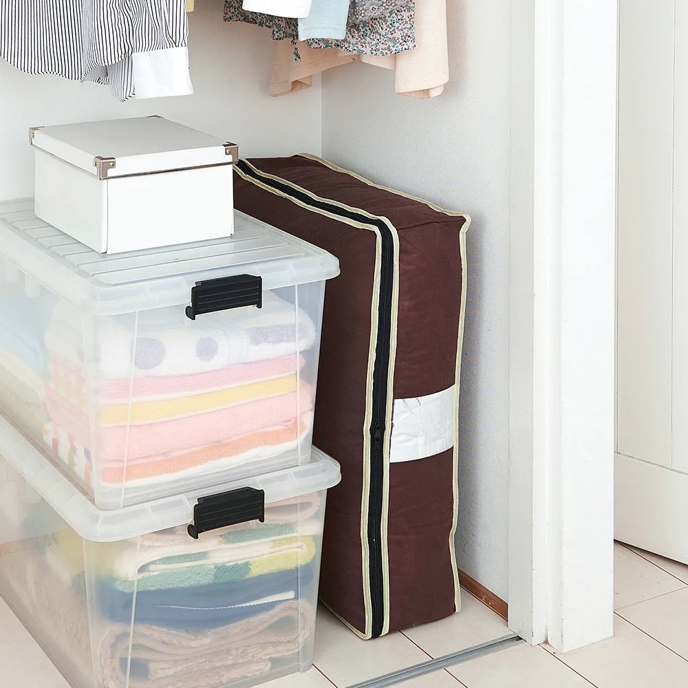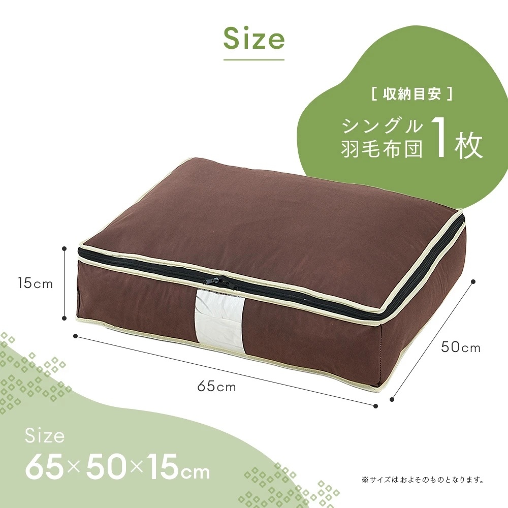 シーズンオフの布団や普段使わない来客用の布団をコンパクトに収納。シングルサイズの掛布団や敷布団、枕がちょうど収まる大きさです。商品画像の説明