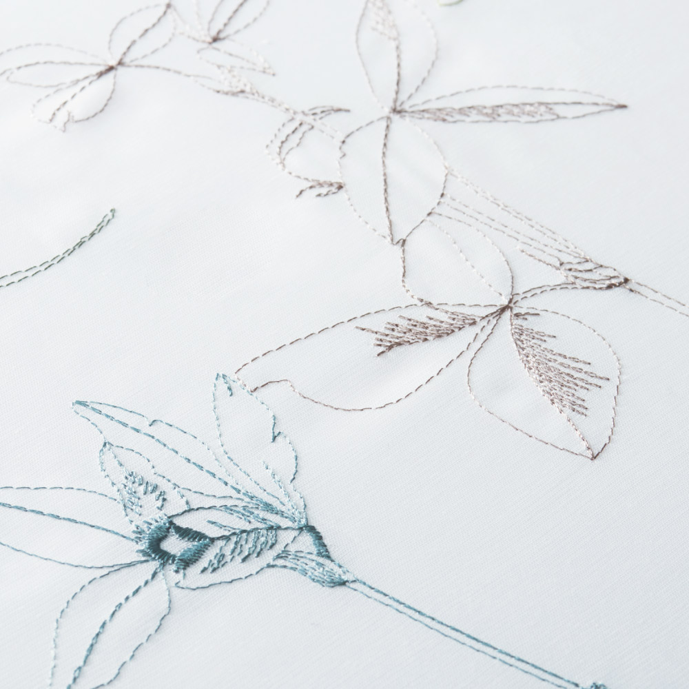 • 生地の色ホワイト(写真はミックス調防炎・遮光カーテン ブルーグレー系とのコーディネート) 繊細で落ち着いた色合いの草花刺しゅうが、ナチュラル感漂う大人の窓辺に。 ※お届けはレースカーテンのみになります。(100cm幅2枚組・200cm幅1枚)
