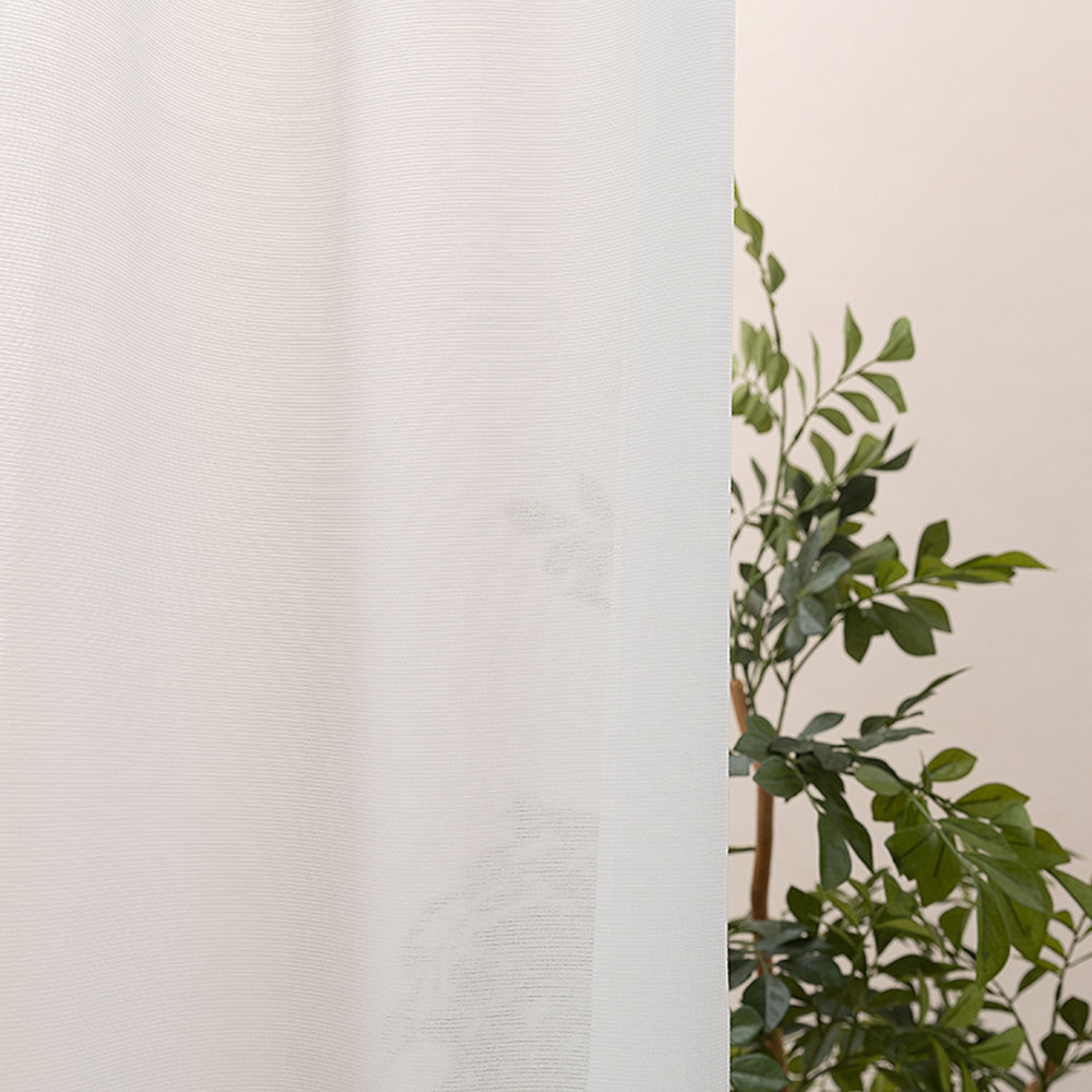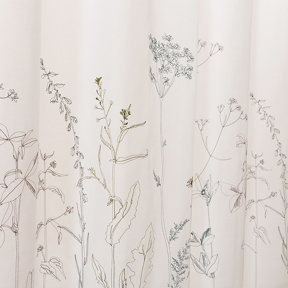野に咲く愛らしい草花を、裾部分に刺しゅうで軽やかに表現したボイルレースカーテン。裾からスッと伸びあがった姿が、可愛らしい印象です。プリントにはない立体感があり、洗練されたナチュラル感が漂います。UV対策にもなりますので、おしゃれと機能性、どちらも欲しいという方にぴったり。来客用のお部屋のカーテンにも素敵です。【ポイント1】優しい配色の刺しゅう