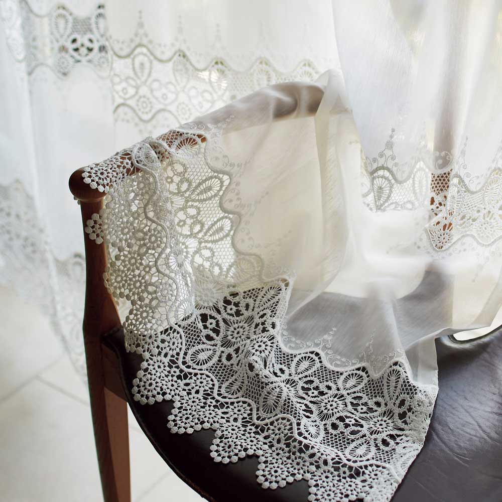 トルコ製のレースカーテンで、刺繍模様が繊細で華やか。ハギのない一枚布仕様なのでグレード感があります。