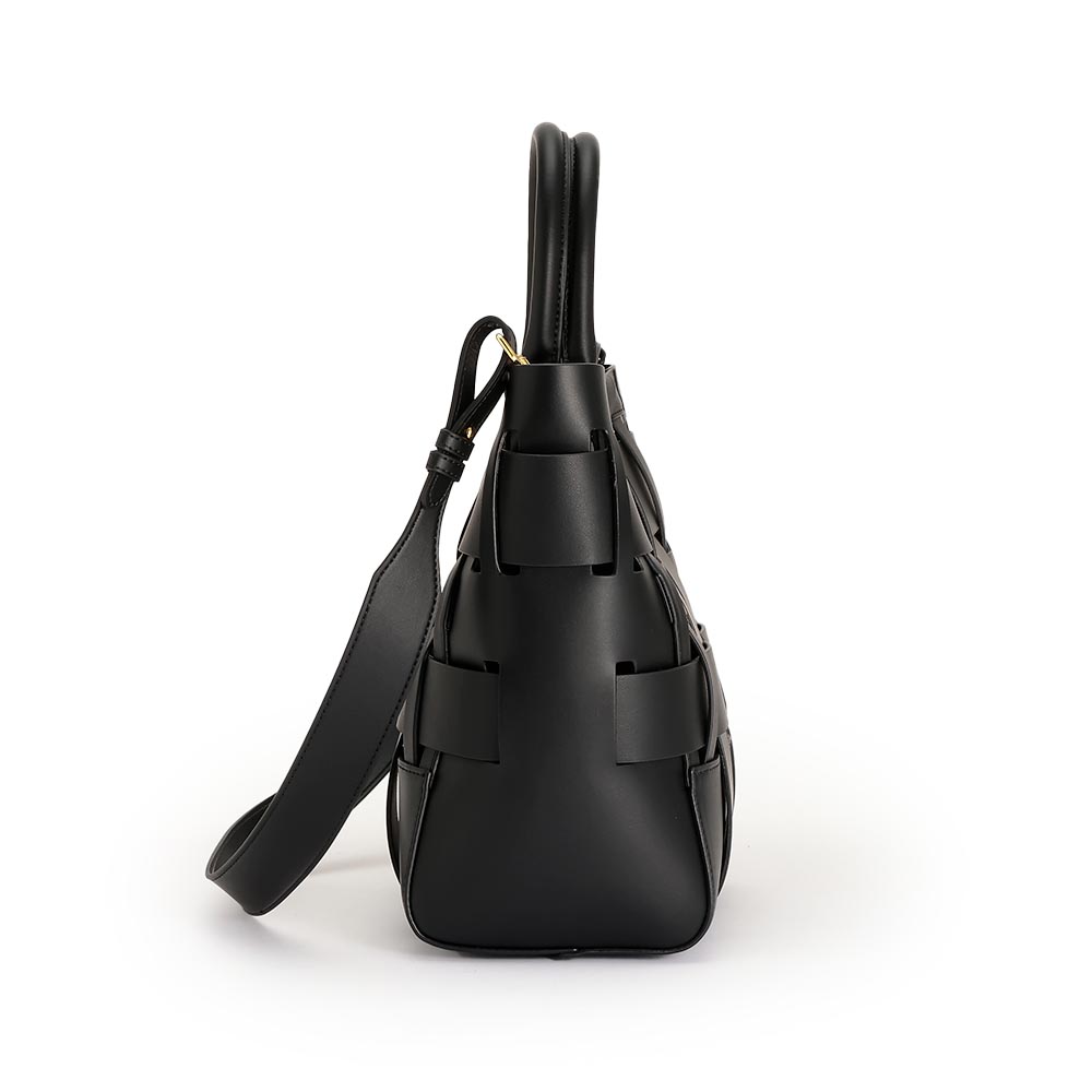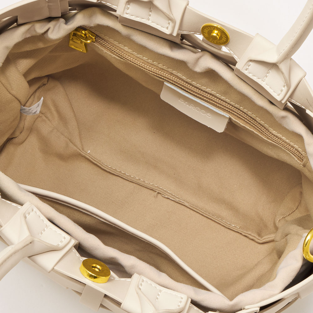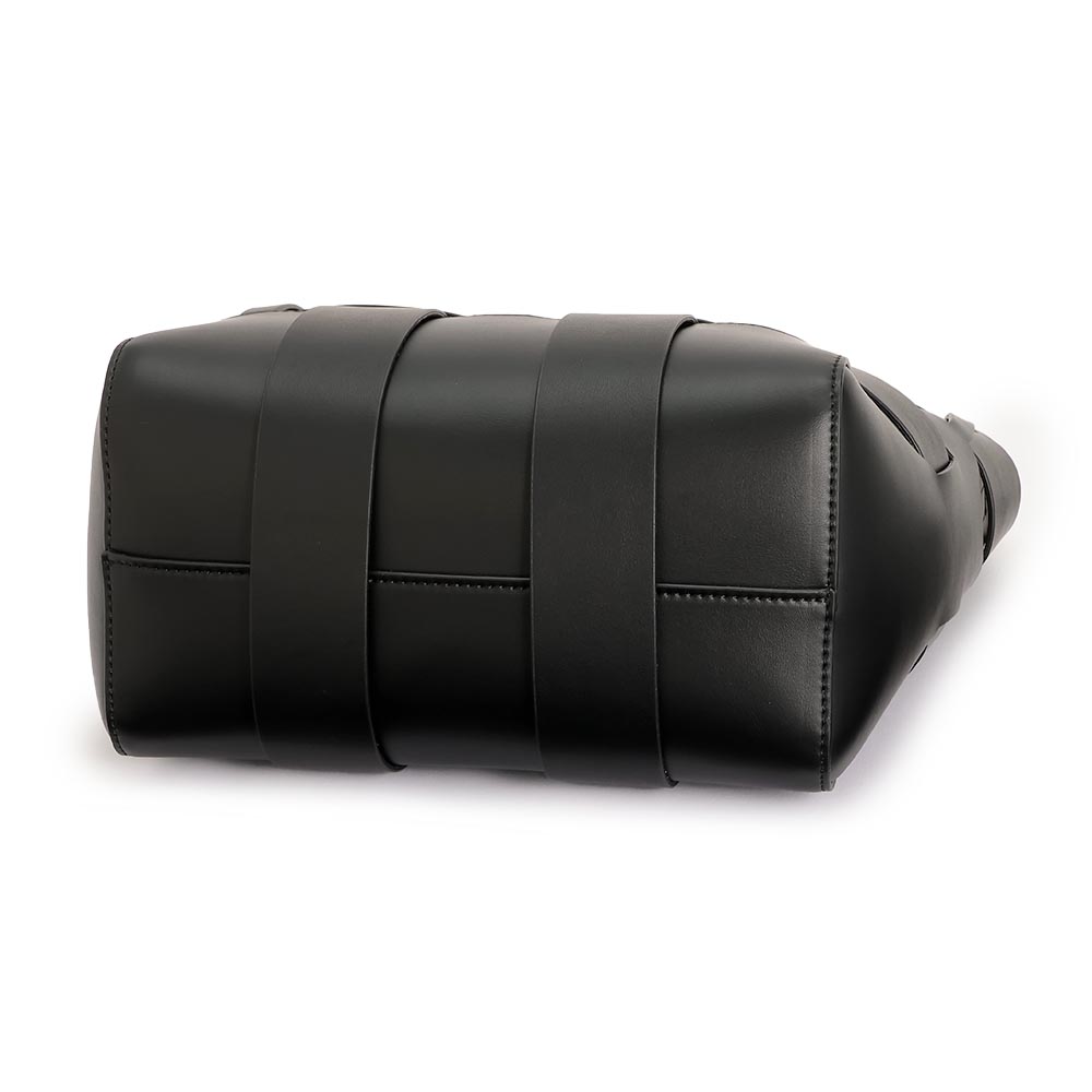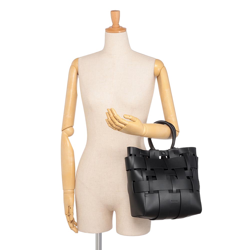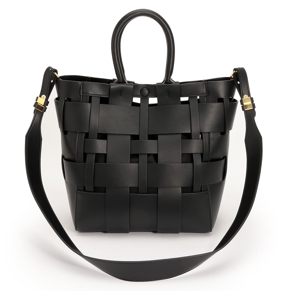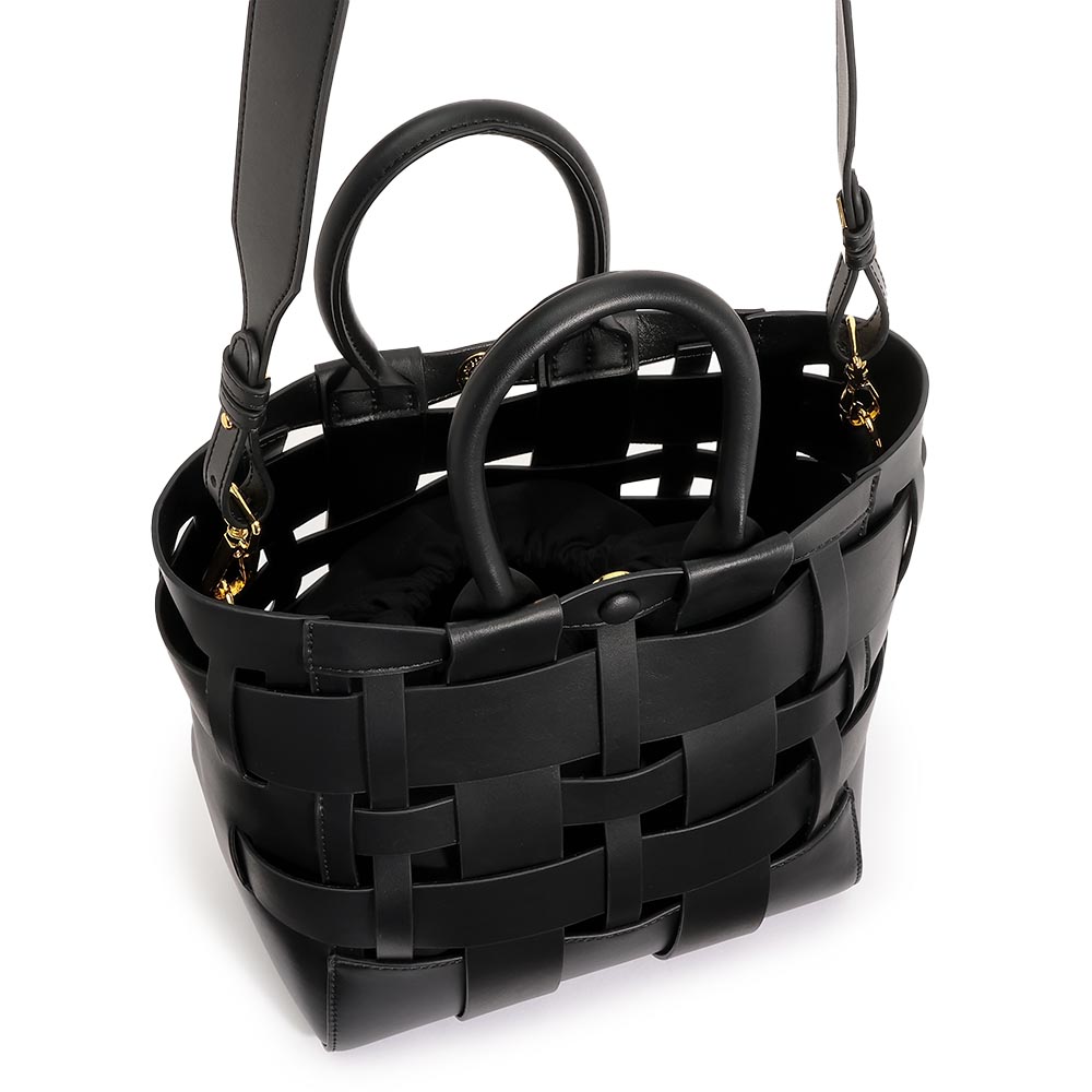 幅の違うパーツを透かし編みにしたモダンなメッシュバッグ。ハリ感のある素材が立体的なフォルムをキープしてくれます。ポケットが充実した巾着タイプのインポーチ付きで、丸手ハンドルとショルダーの2WAYで活躍します。商品画像の説明。