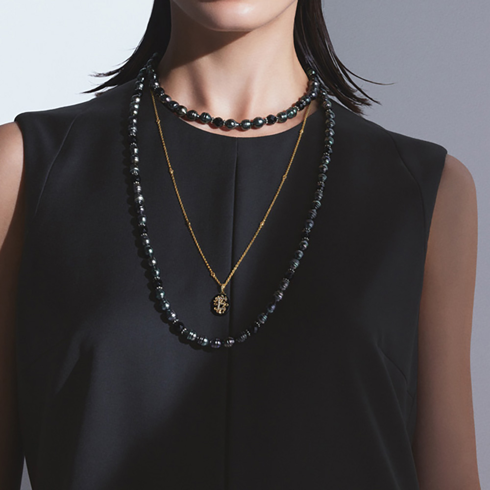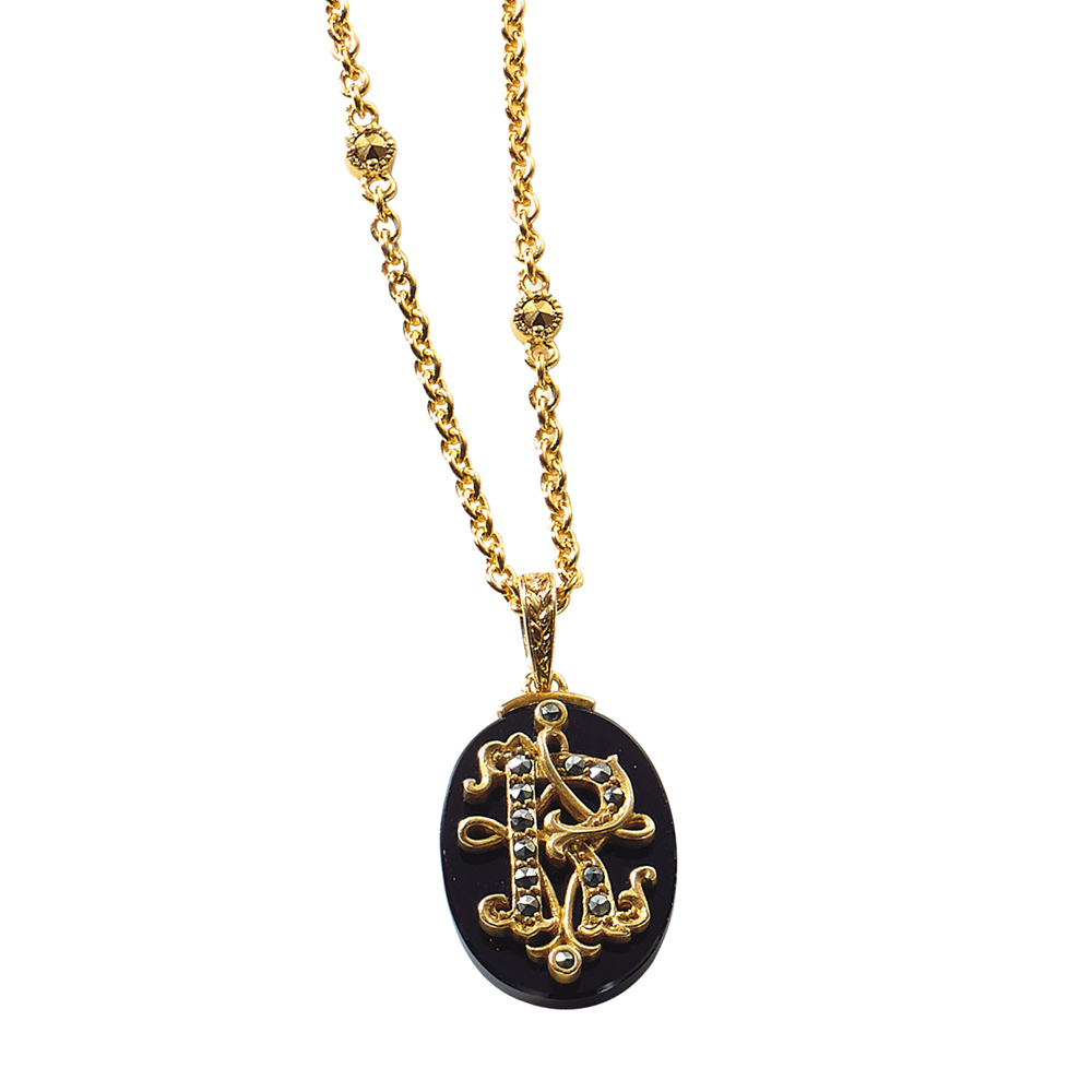 オニキスのプレートの上に飾り文字でイニシャルをのせた、アンティーク調のイニシャルペンダント。漆黒のオニキスとゴールドカラーの組み合わせがマッチしたヘッド部分は、流麗な線の飾りがエレガントでマルカジットが繊細に輝きます。マルカジットを留めたパーツをステーション状にしたネックレスを合わせました。
