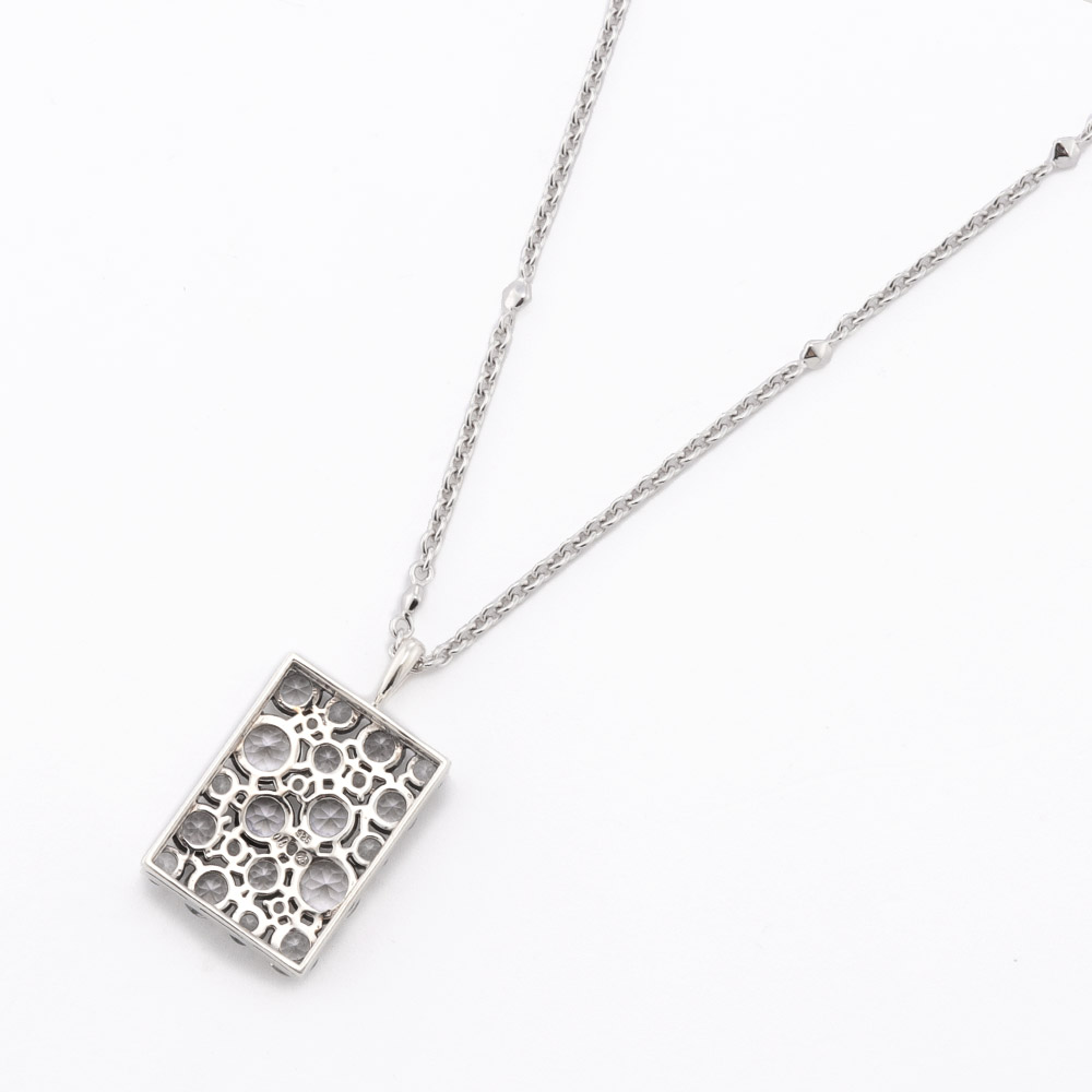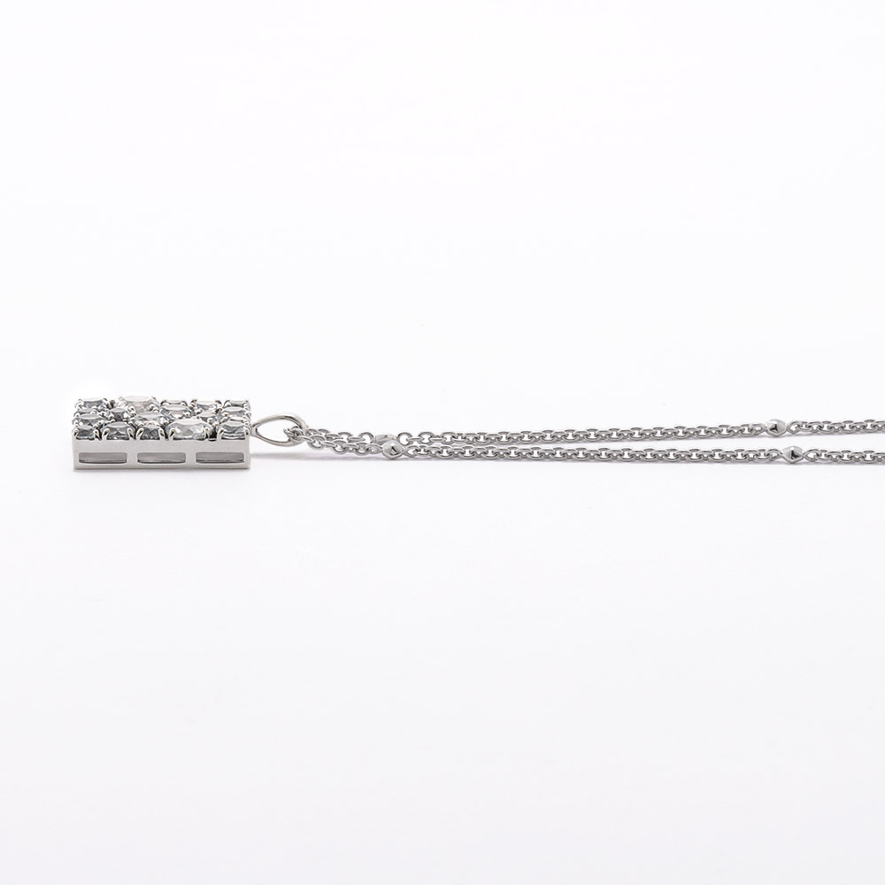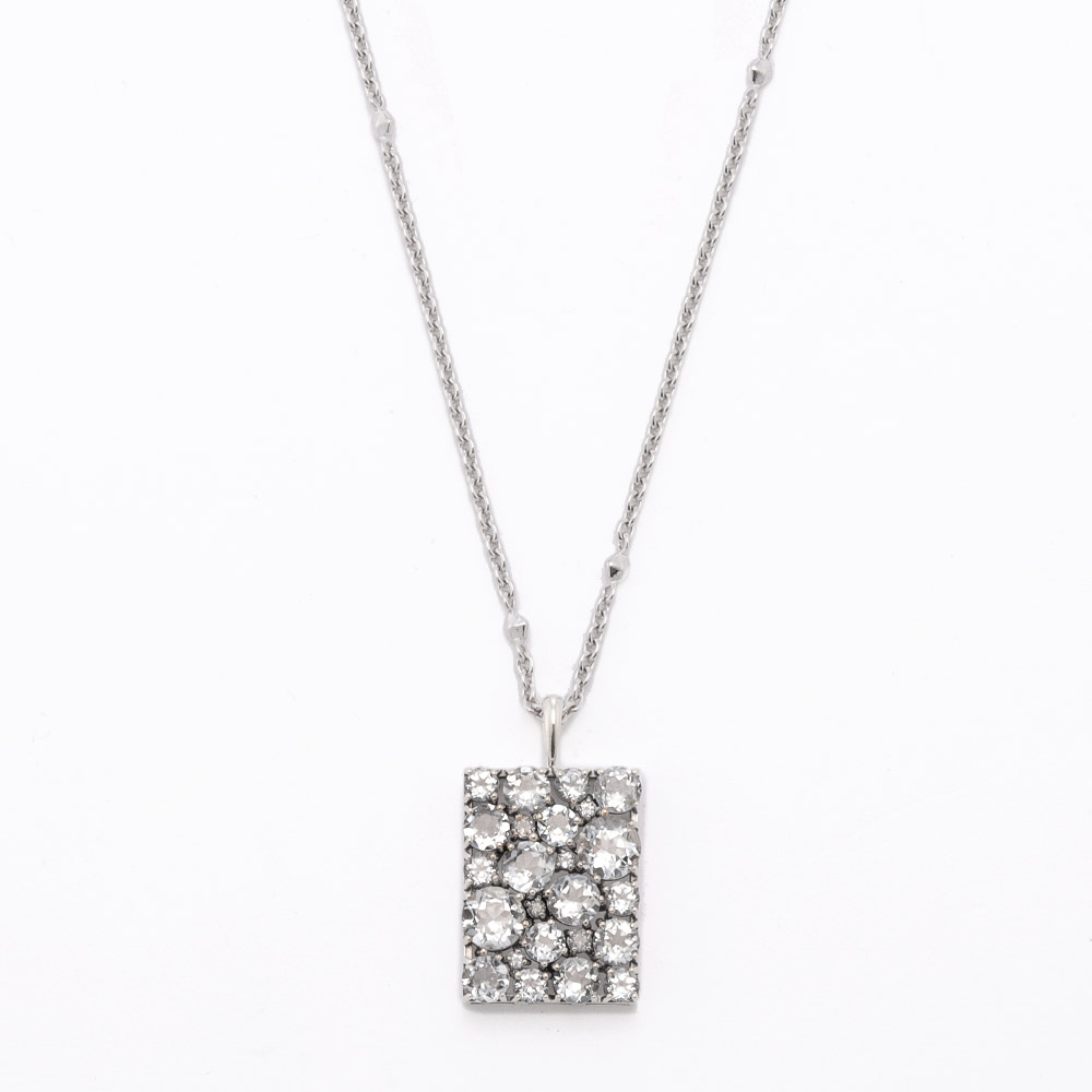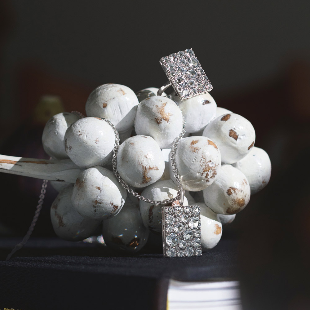 ジュエリーとは、外見だけでなく心の内までを照らしてくれる光。優雅に瞬くその輝きは、自分自身を表現するもの。肌の一部のようにするりと馴染む煌めきと、いつも一緒に。スクエアフォルムに大小のホワイトトパーズを隙間なく敷き詰めたモダンなロングペンダント。サイズの異なる石をランダムに配し、華やかな輝きのリフレクションが楽しめます。古美仕上げにすることで、ヴィンテージライクなムードに。