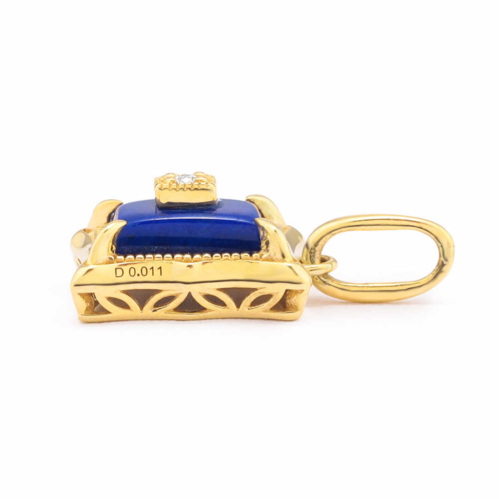 深く美しいロイヤルブルーのラピスラズリにあしらった中央のダイヤモンド装飾が繊細に輝き、クラシカルな額縁のようなフレームデザインと相まって美しいペンダントヘッドです。上品でエレガントな佇まいはフォーマルにもカジュアルにも合わせやすく、一点もののような特別感を演出します。大切な方への贈り物としても最適です。クリップタイプのネックレスに重ね付けしてもよく合います。