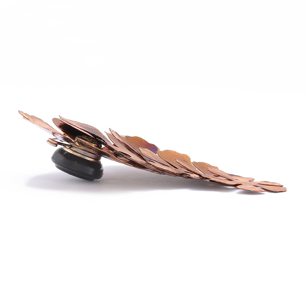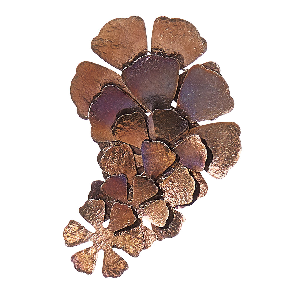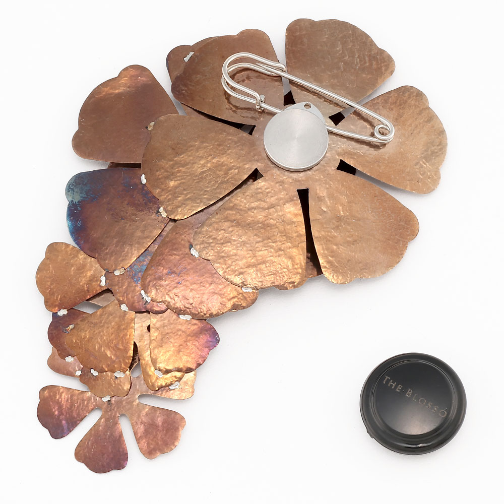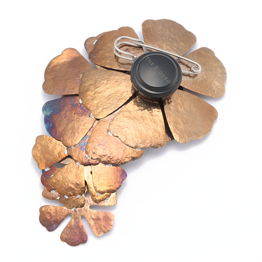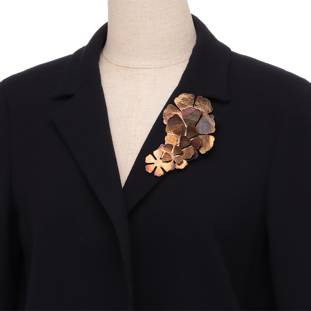 変色しにくく、金属アレルギーを起こしにくいサージカルステンレスで作られた“咲き続ける花”のアクセサリー。北斎をイメージしたやや紫を帯びた趣深い色と重なり合う花々が表情豊かなデザイン。ブローチはつけやすいマグネット仕様。商品画像の説明