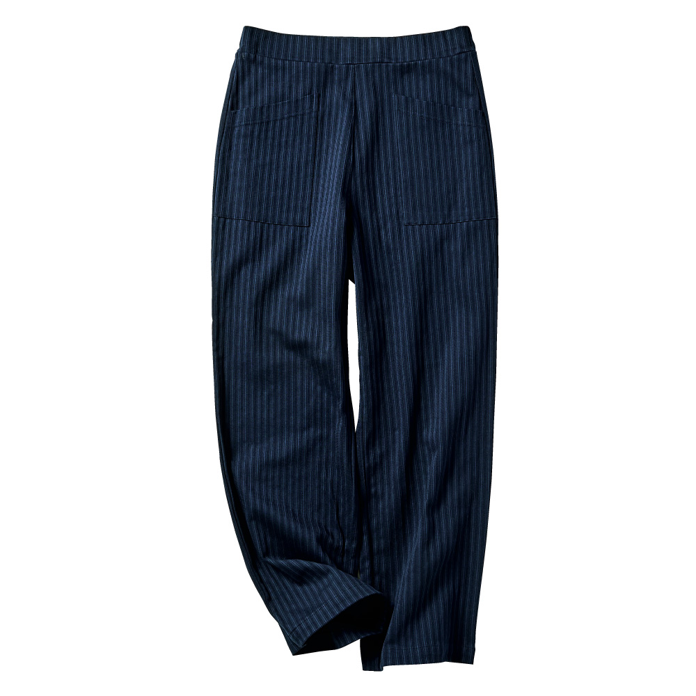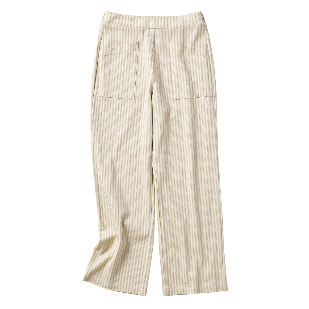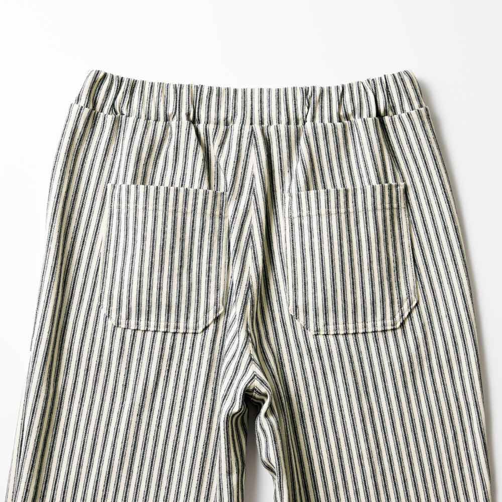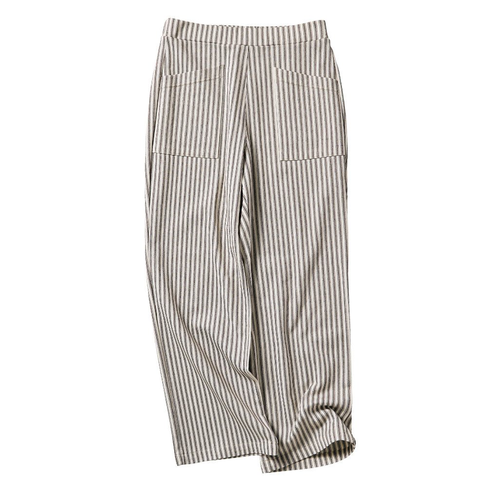 大きめパッチポケットがポイントのヒッコリーストライプ柄は、抜け感のあるカジュアルさが人気の理由。シルエットを見直して、よりスマートな印象のワイドストレートに仕上げました。商品画像の説明。
