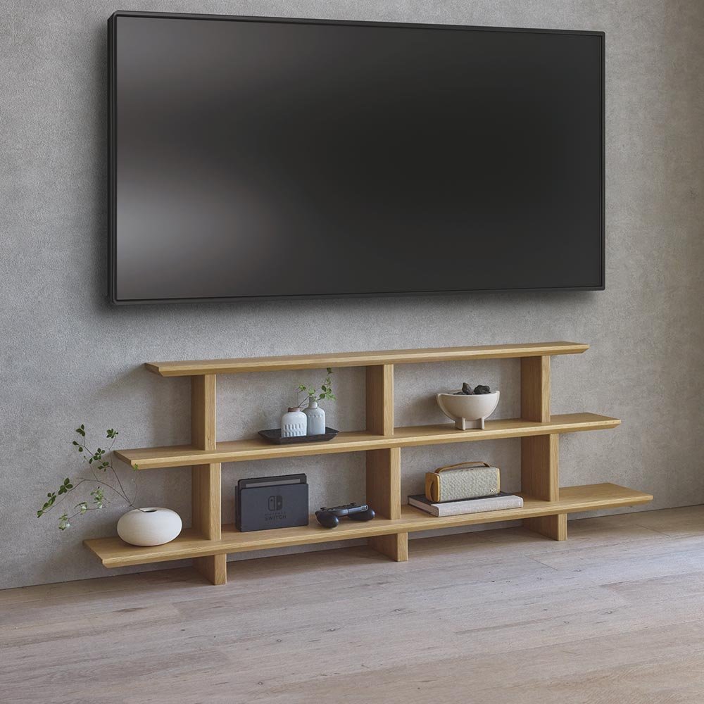 薄型設計で壁掛けテレビの下のスペースを無駄なく使えます。ゲーム機や雑貨など小物をすっきり美しく収納。材は、耐久性の高いオーク材