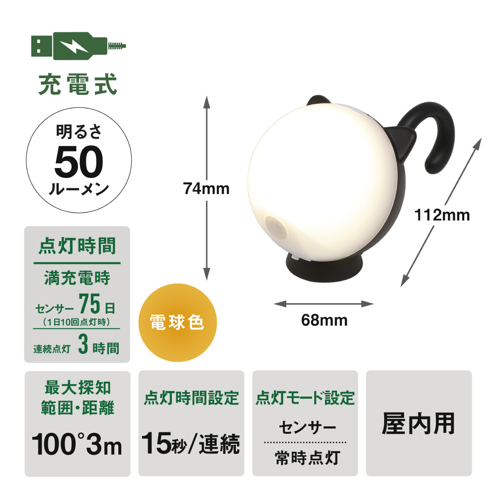 充電式まんまるねこちゃんセンサーライト 照明器具 ライト 時計 KR0420