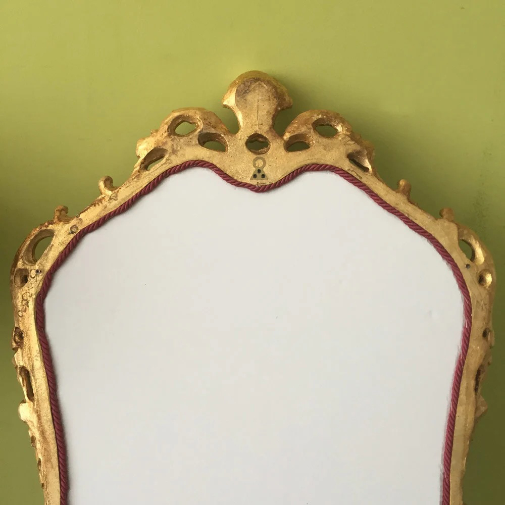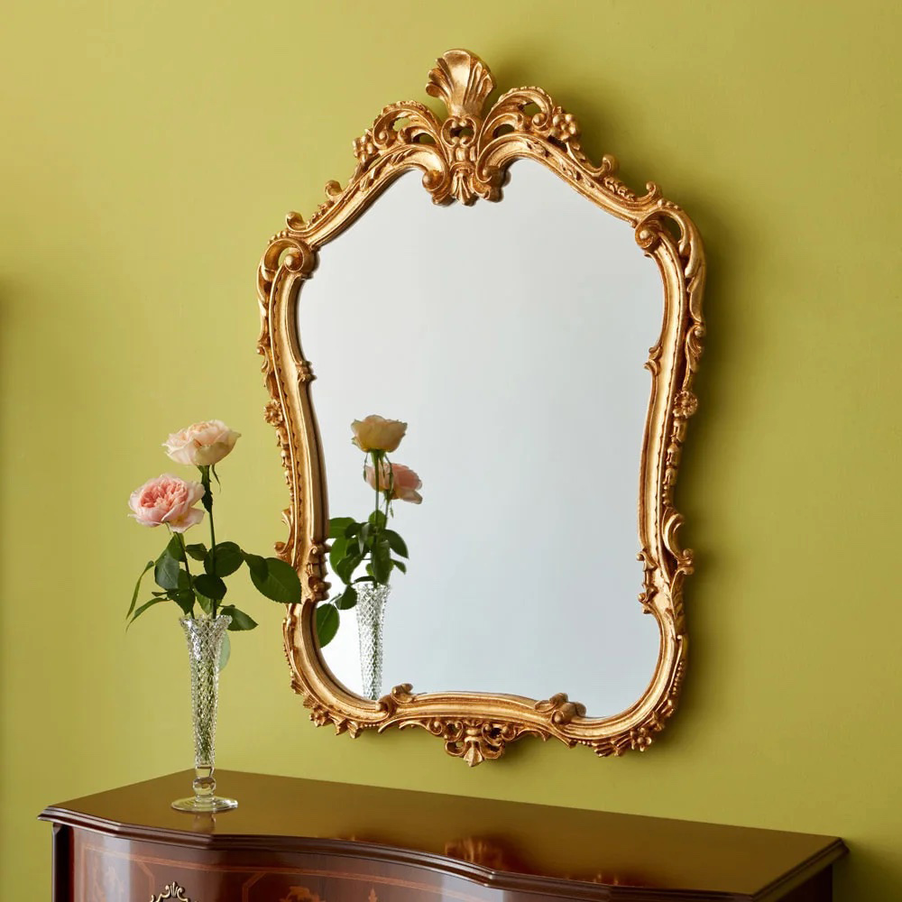 ◆華やかな彫刻と金箔調の化粧を施したデザインが美しい壁掛けミラー。