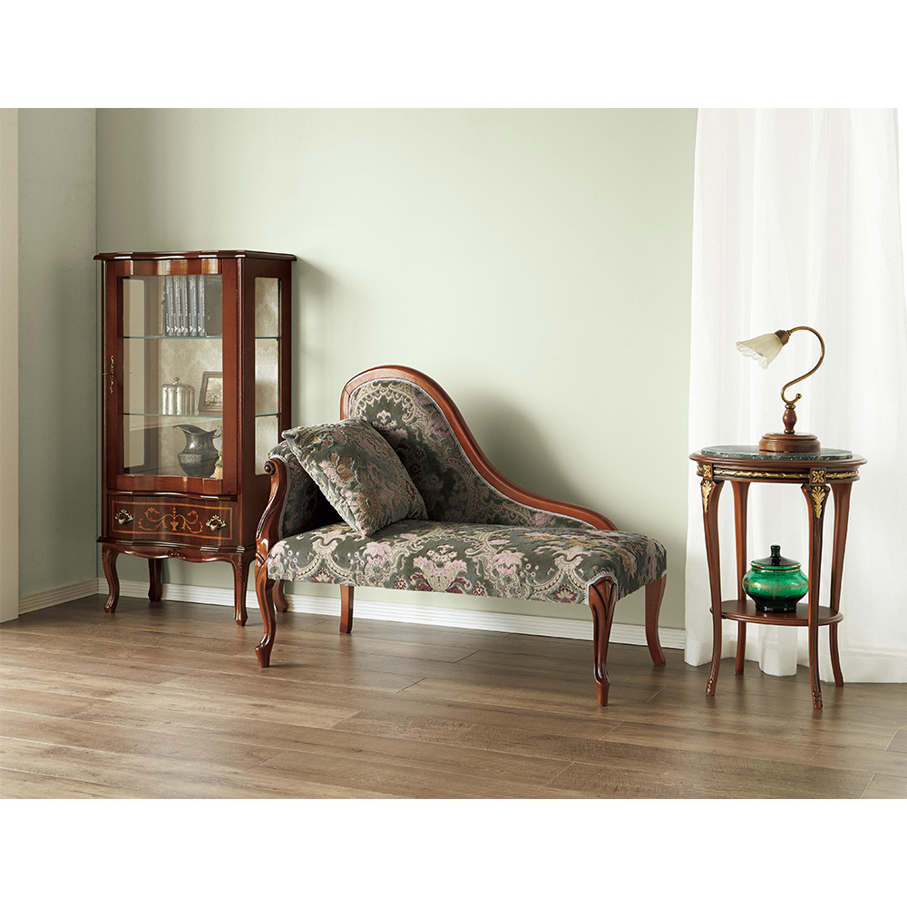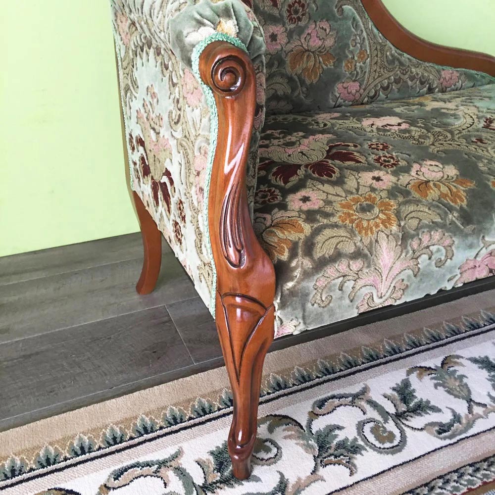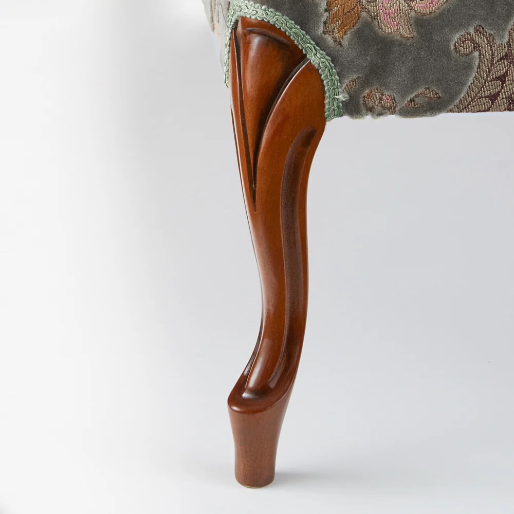 ◆手彫りの繊細なアンティーク彫刻が、フレーム部分や脚部全体に施されています。◆フレームと脚部は飴色に輝くブラウン塗装仕上げ。使いこむ程に味わいが出て長年に渡って優美な表情をお楽しみいただけます。