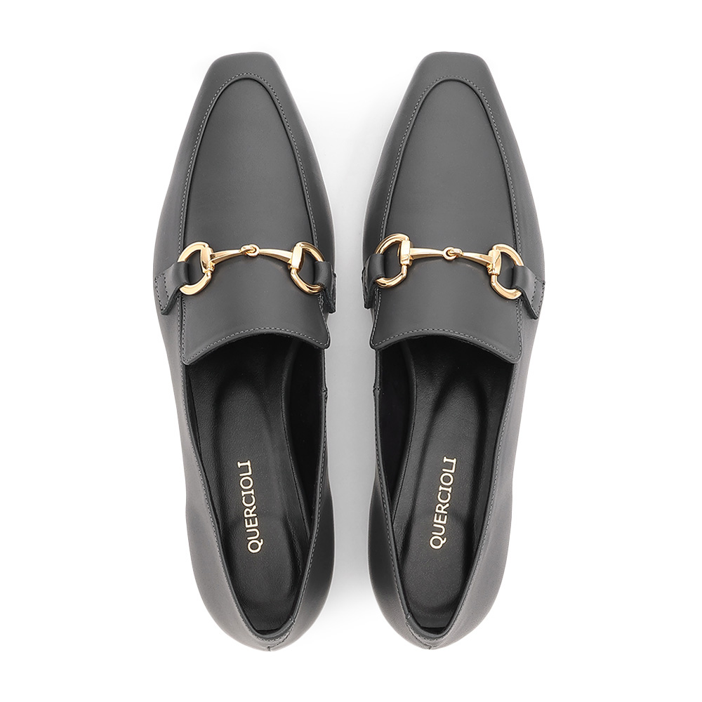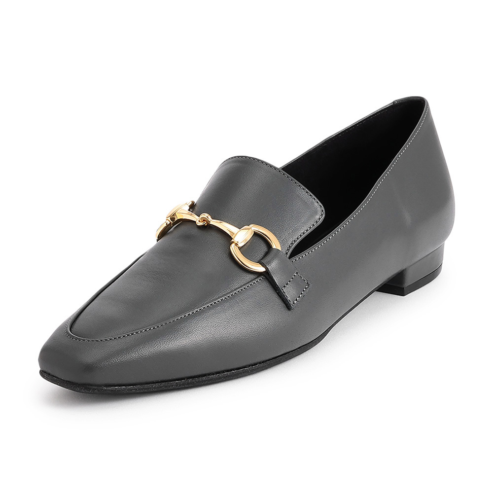 ソフトで程良い艶感が優美なスムースレザーや歩きやすい切り込み加工の中底など、見た目と履き心地を追求したフラットパンプス。華やかなビット金具とニュアンスカラーが、印象を軽快に。商品画像の説明