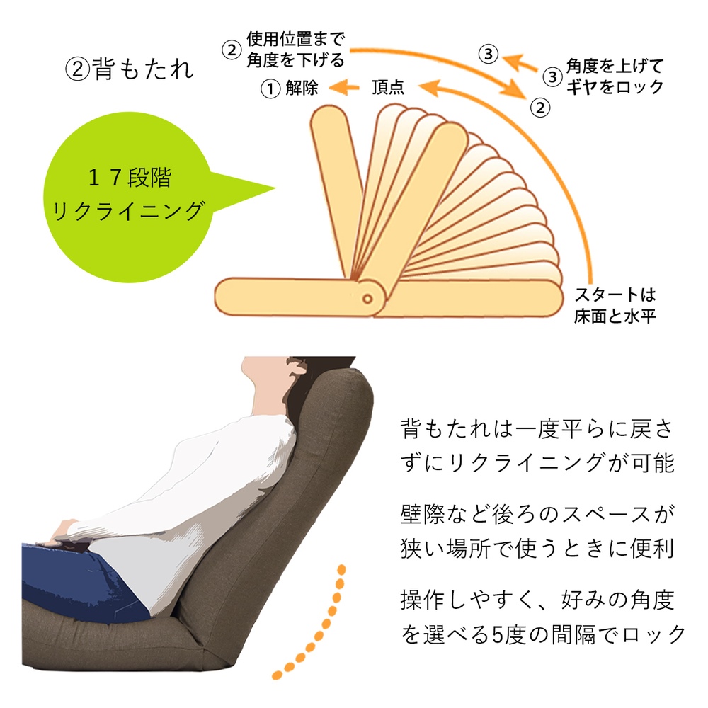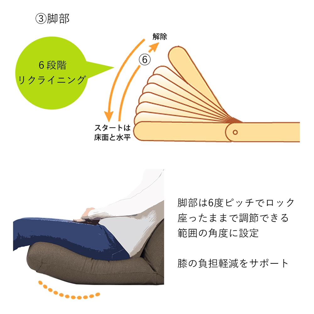 ◎脚部は6段階でリクライニング調節が可能です。ひざ裏にフィットし、支えてサポートするので足元ラクラク。お尻の前すべりも防止できます。