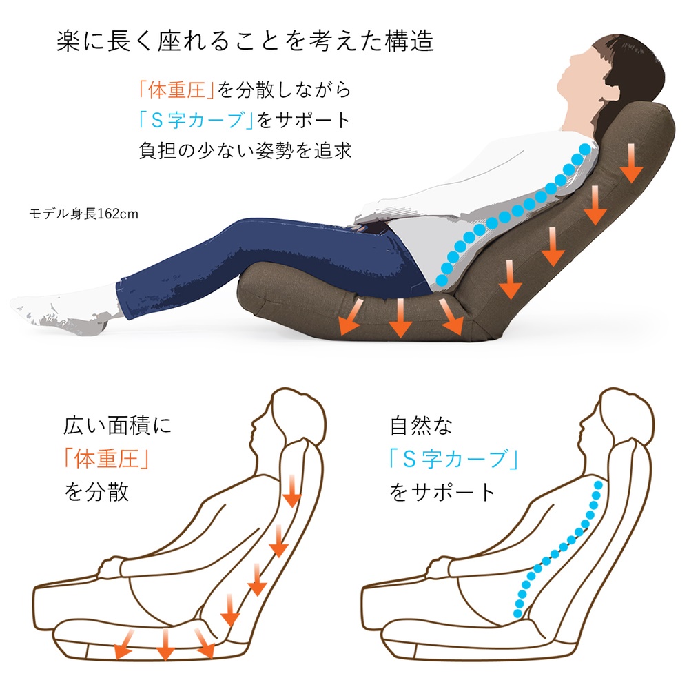 ◎曲面形状の背もたれが背筋のS字曲線を保ち、「体重圧」を分散します。