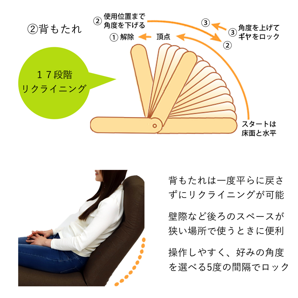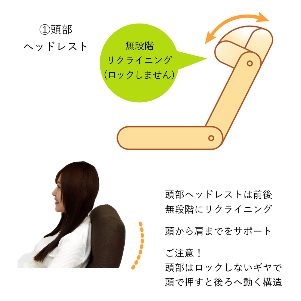 ◎頭部、背もたれ、脚部の3ヶ所のリクライニングでゆったりと全身リラックスできます。◎頭部は無段階、背もたれは17段階でリクライニング調節が可能。頭部にフィットし、頭や首が疲れません。