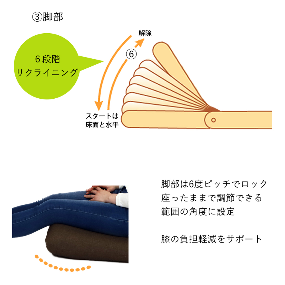 ◎脚部は6段階でリクライニング調節が可能です。ひざ裏にフィットし、支えてサポートするので足元ラクラク。お尻の前すべりも防止できます。