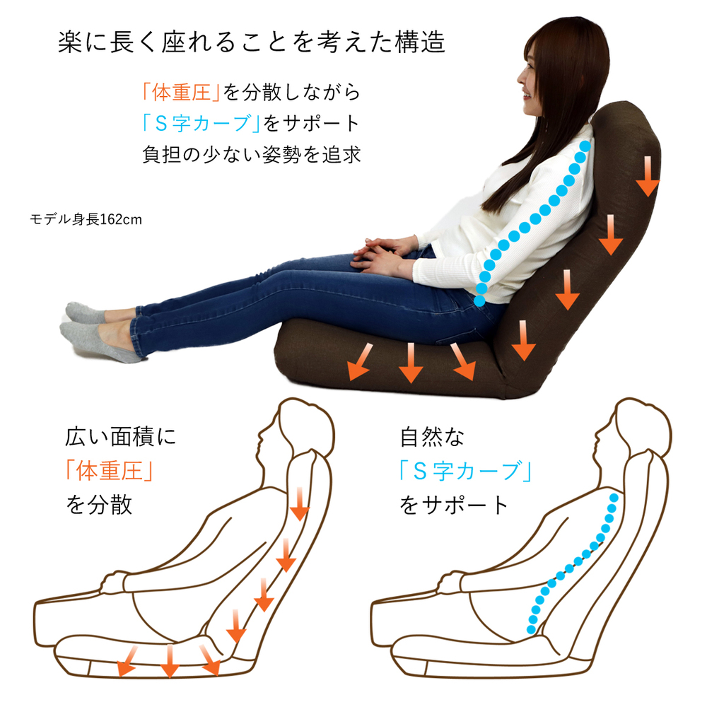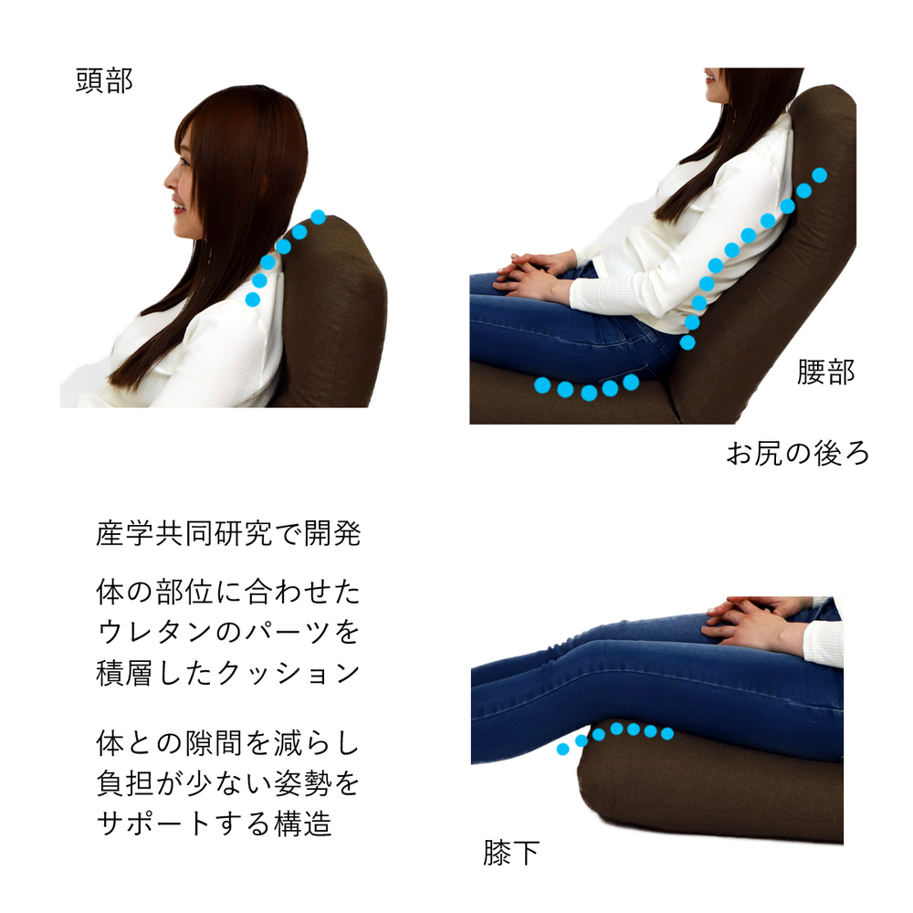 芝浦工大と国内の座椅子メーカーが共同研究した、『腰に優しく疲れにくい』ラクラク座椅子。独自の内部構造により手で押されているかのように心地よく背筋が伸びます。