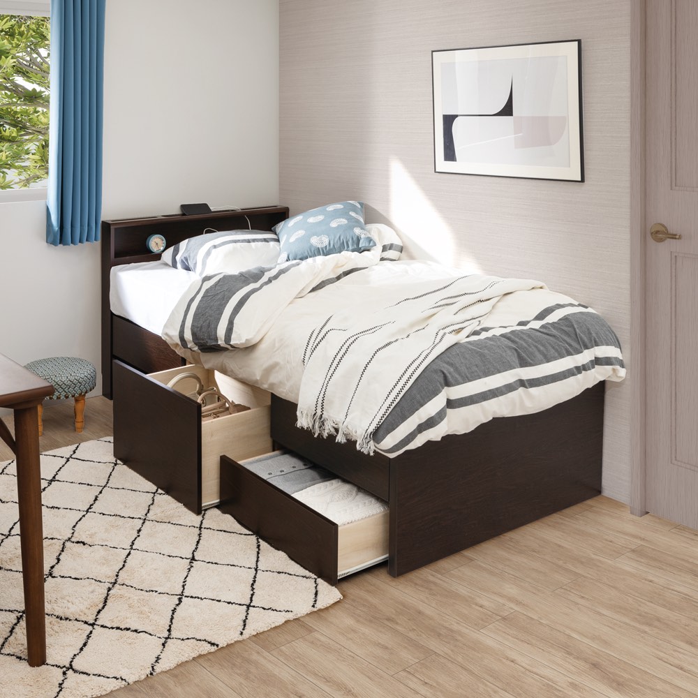 寝室が狭くてチェストが置けない。引き出し付のベッドが置けない。部屋が散らかりっぱなし。こんな悩みはサイズが選べる省スペース対応引き出しベッドが解決します。
