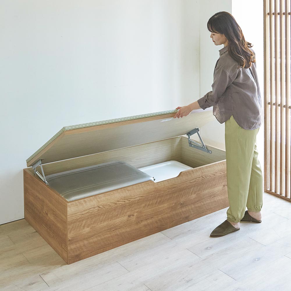 畳面はダンパー構造で開閉をサポート。簡単に開け閉めできます。高さ45cmタイプはスーツケースや家電、収納ケースも収納可能。(収納部内寸高さ35cm)