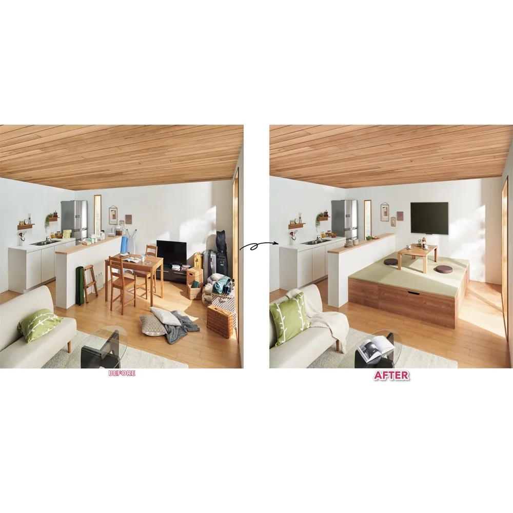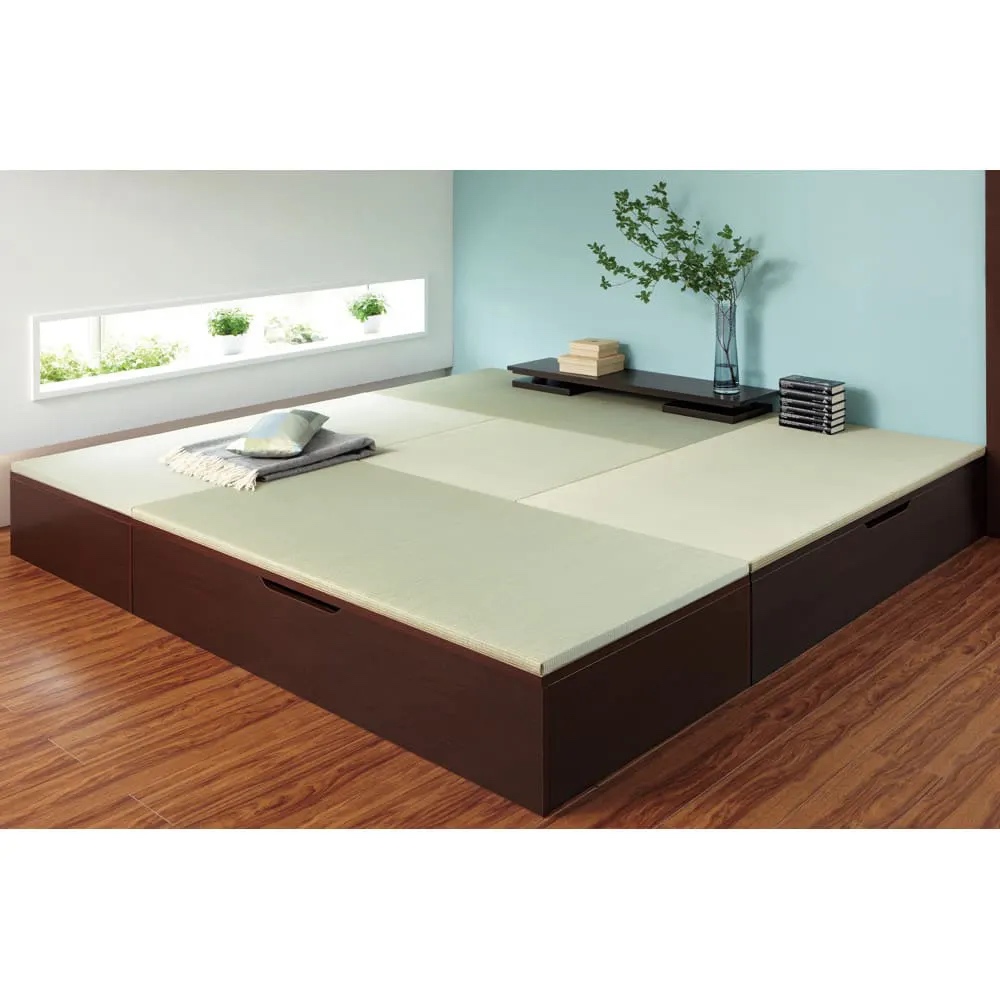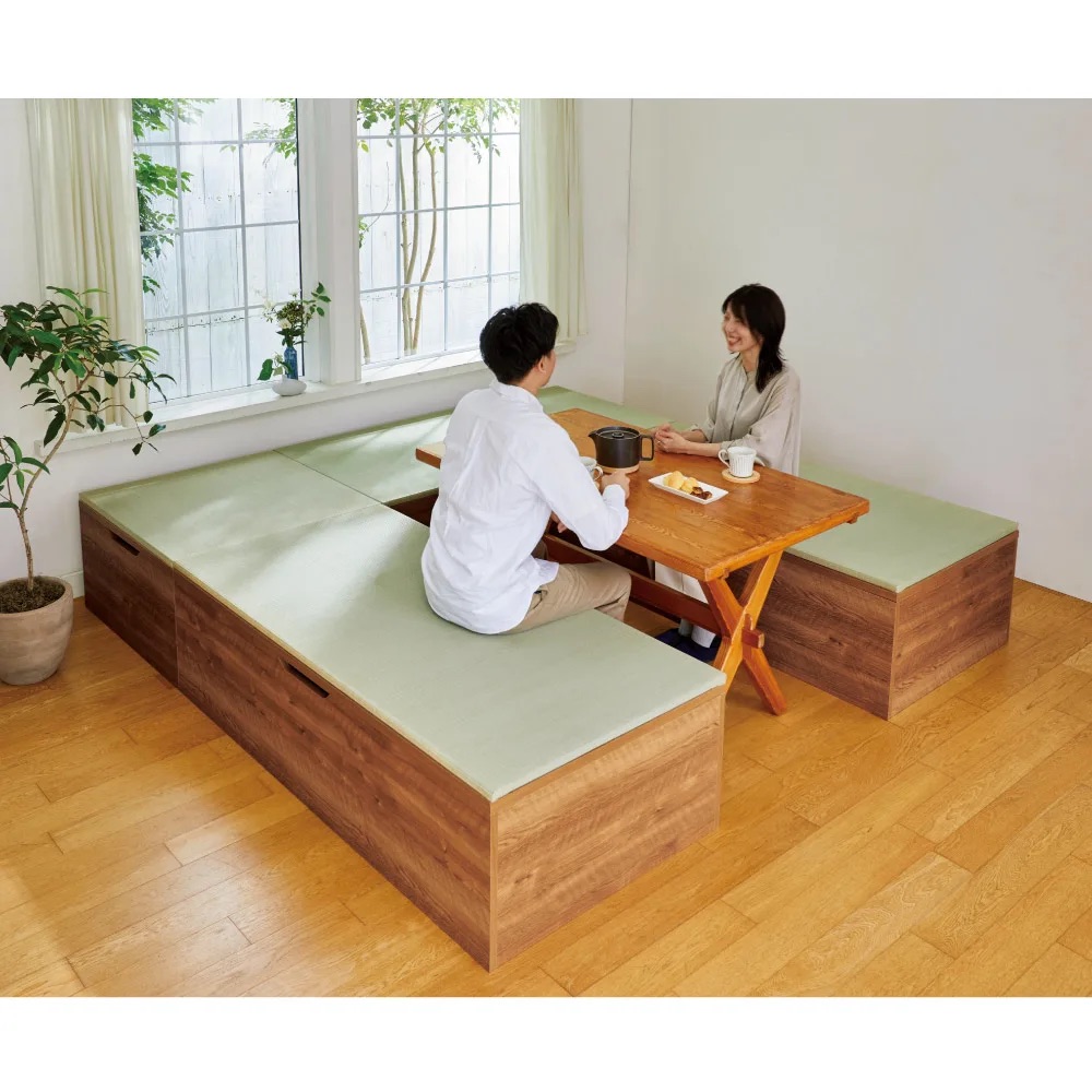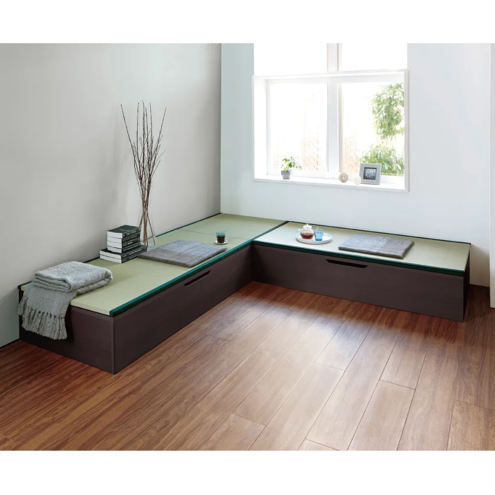 ミニマルな暮らしのお手本として注目されている和の住まいの進化形。置くだけで凛とした空間が生まれ、収納不足も解消します。(※写真はヘリ無・半畳+1畳×4・高さ45cm)