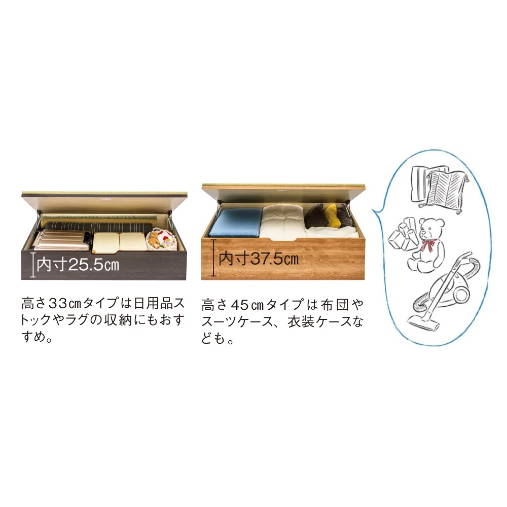 ◆高さ33cmタイプには1畳分に布団やラグなどが収納可能。