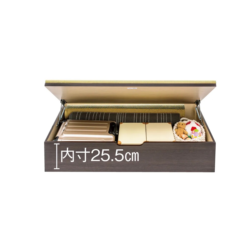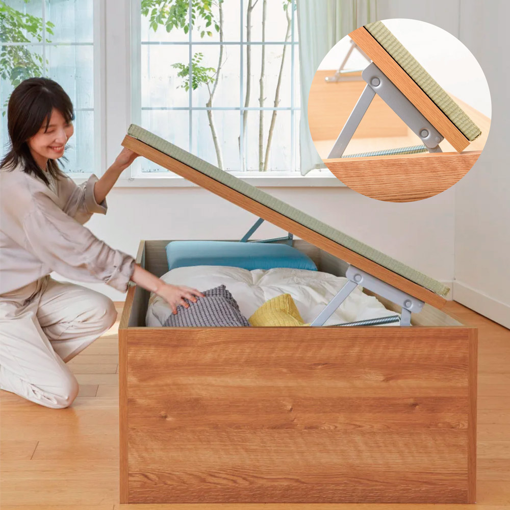 ◆畳の載った蓋部分はスプリング付きの跳ね上げ式。女性でも簡単に持ち上がり、開けるとぴたっと固定されるので出し入れもスムーズです。