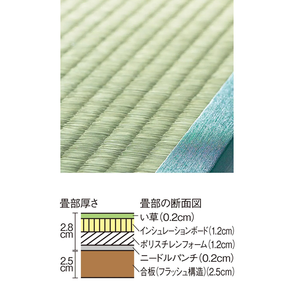 畳表には100%天然のい草を使用。リラックスできる香りのい草は調湿性があるのも特長です。(写真下:畳部の断面図)