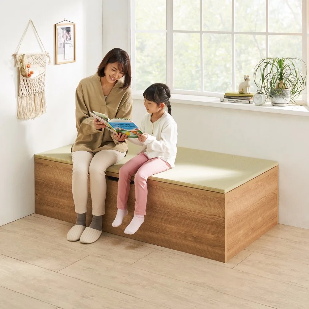 • ミニマルな暮らしのお手本として注目されている和の住まいの進化形。置くだけで凛とした空間が生まれ、収納不足も解消します。(※写真はヘリ無・半畳+1畳×4・高さ45cm)