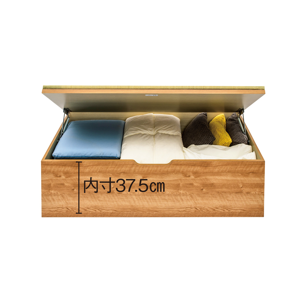女性でも楽々!スプリング付き跳ね上げ式畳畳の載った蓋部分はスプリング付きの跳ね上げ式。女性でも簡単に持ち上がり、開けるとぴたっと固定されるので出し入れもスムーズです。日常の使い勝手をもっと便利に、簡単にするために設計されています。