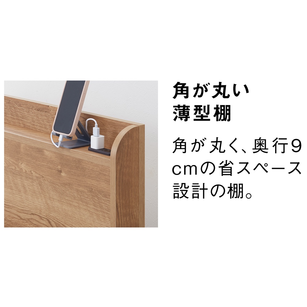 スマホや小物が立てかけられる便利な薄型棚。コンセント付きなので充電もばっちり。◆角が丸い薄型棚