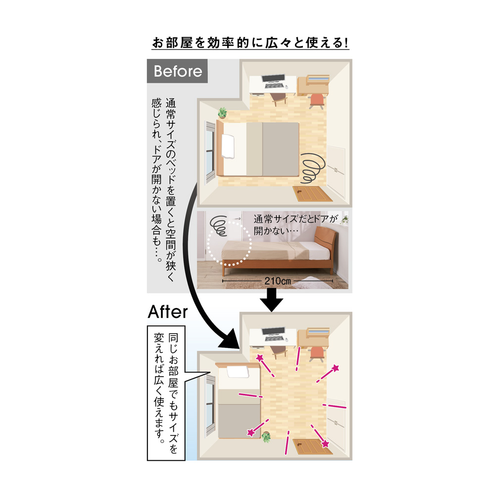 通常のベッドサイズでは置けなかった壁と柱やドアの間にも、あなたのお部屋に合わせた