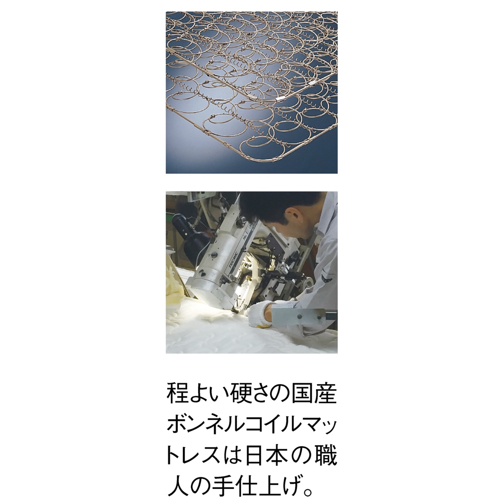 程よい硬さの国産ボンネルコイルマットレスは日本職人の手仕上げ。
