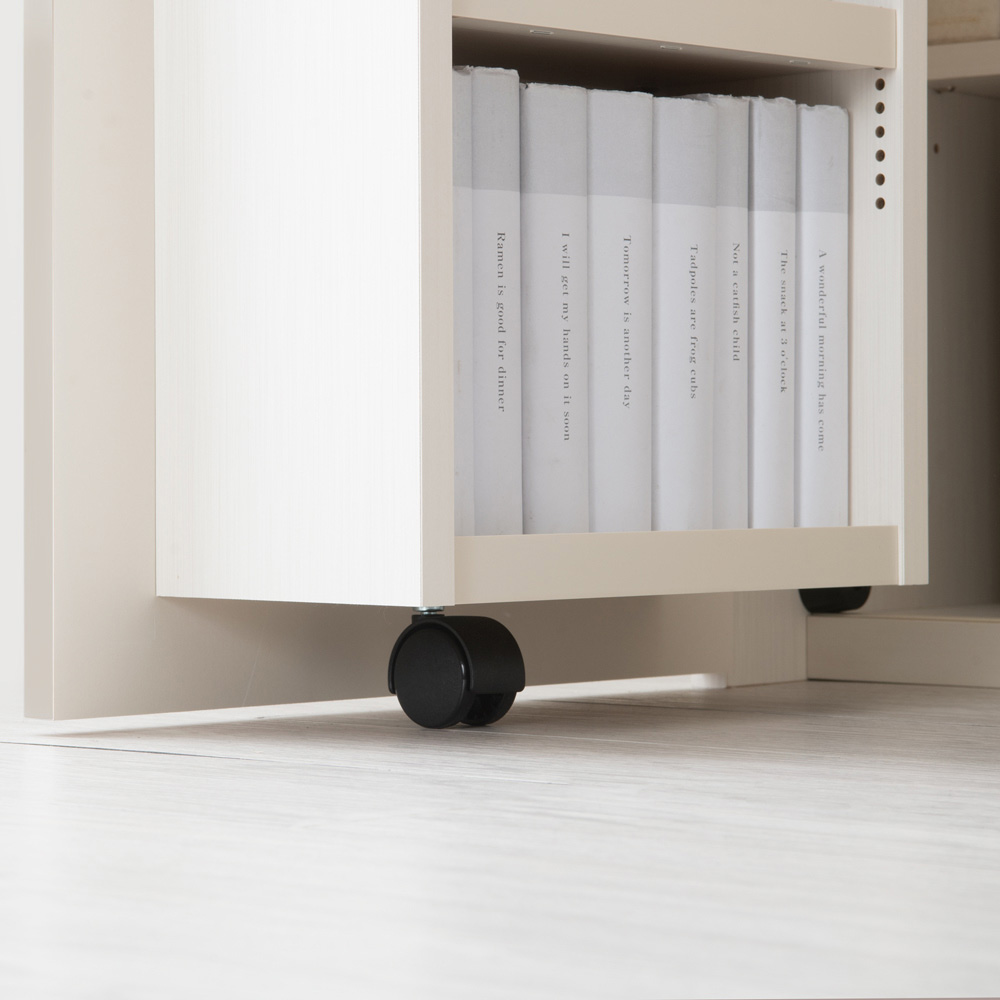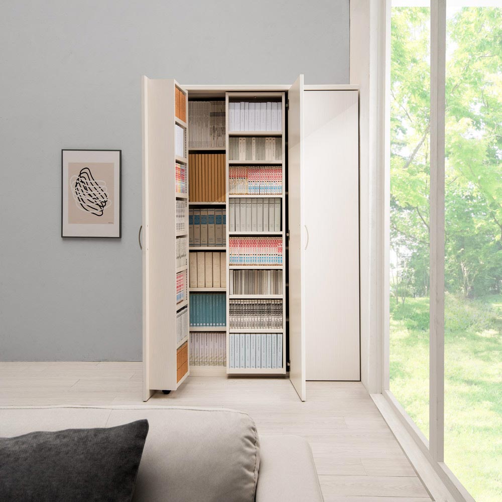 使用イメージ(イ)ホワイト木目 出し入れがしやすく、探しやすいスライド式。多彩なサイズの本を集約できます。 ※写真は別売りの幅80cmタイプ(イ)ホワイト木目です。