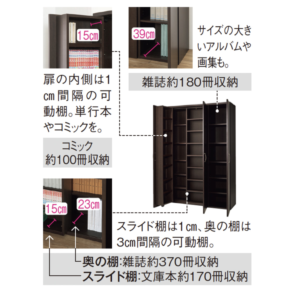 扉の内側は1cm間隔の可動棚。単行本やコミックを。スライド棚は1cm間隔、スライド奥の棚は3cm間隔の可動棚。奥行39cmの右側収納部は子供のアルバム、画集等サイズの大きいものを収納できます。