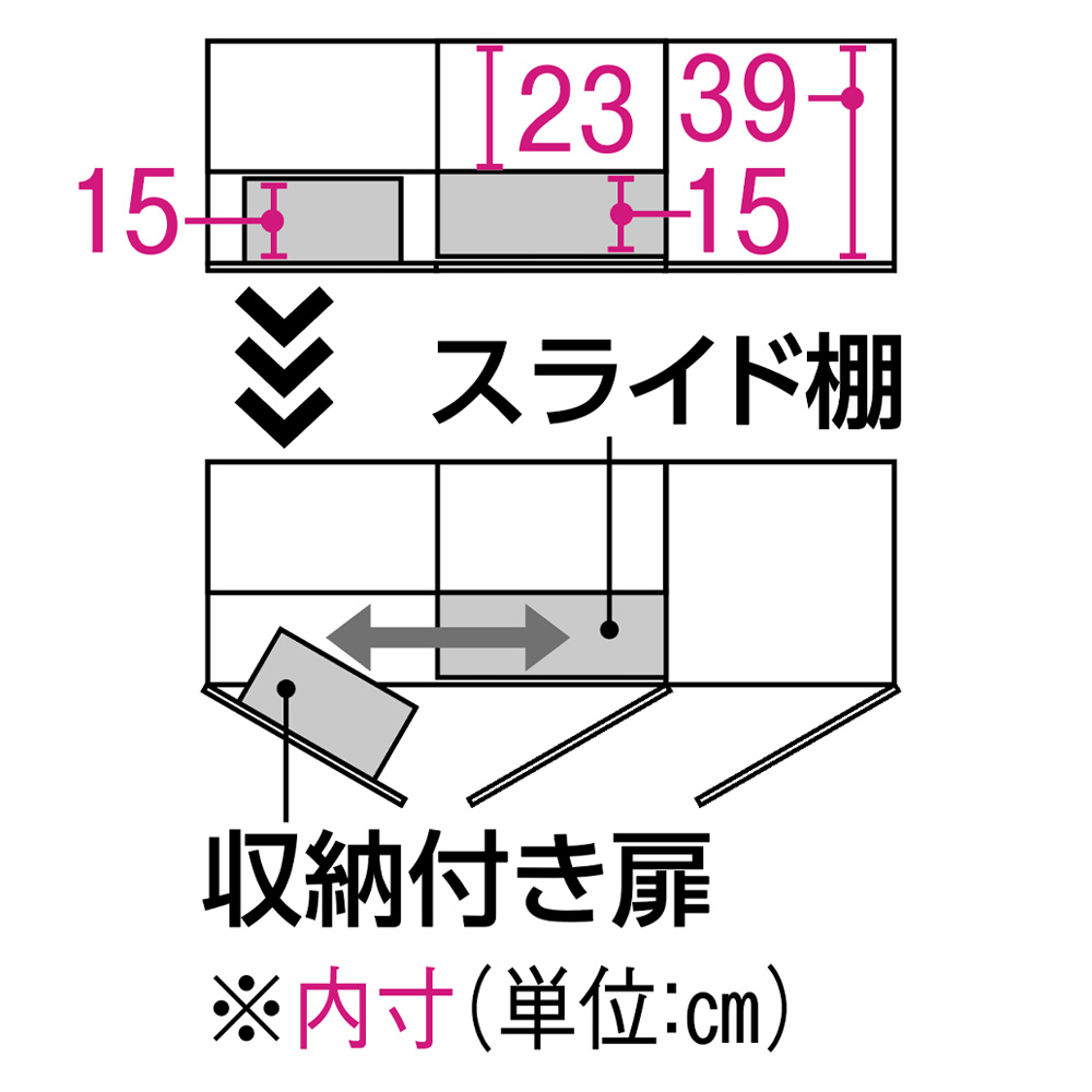 検索しやすいスライド構造。扉裏まで活用するから無駄なく大量収納できます。 ※内寸(単位:cm)