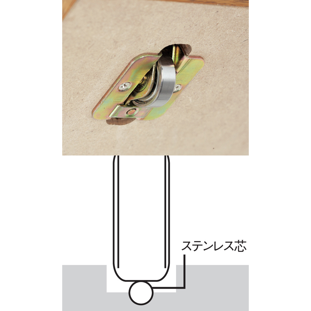 • レール上のステンレス芯と点で接するので、静音でなめらかに動きます。サビや摩耗に強く、1個で約465kgに耐える特殊ベアリングローラーを採用しました。