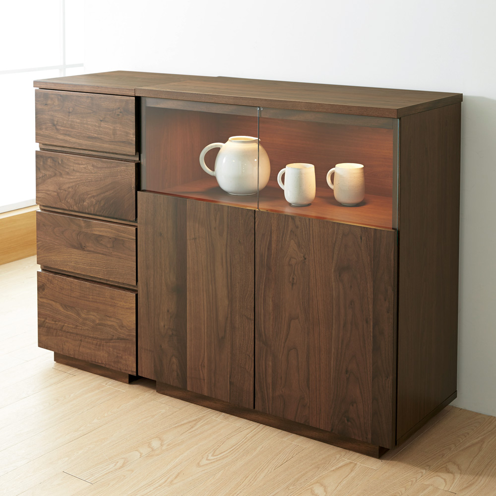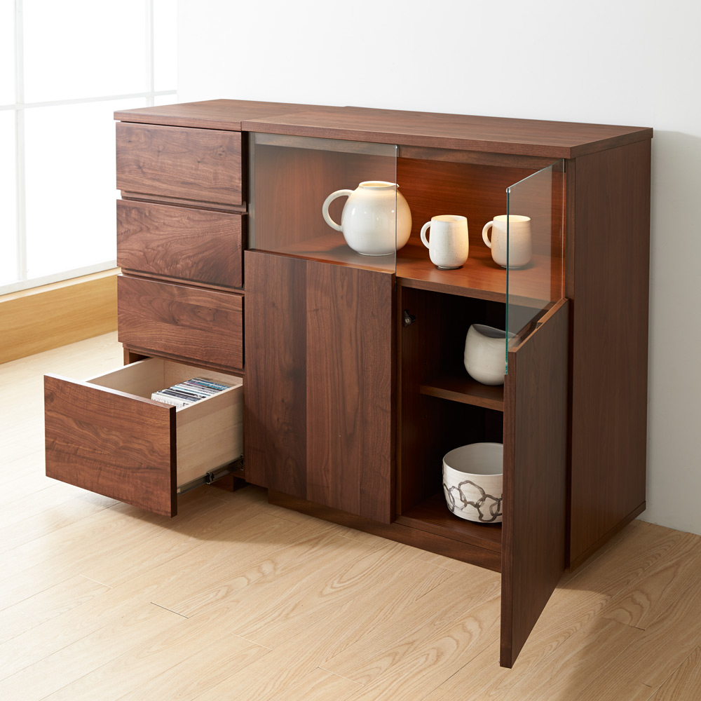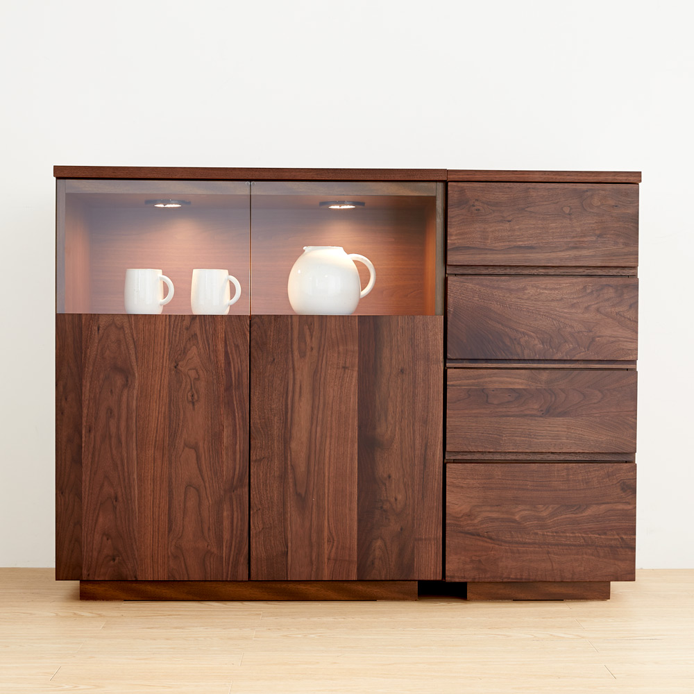 ■前面…ウォルナット天然木(ウレタン塗装)、天板…ウォルナット化粧合板(ウレタン塗装)、側面…化粧合板、ガラス扉…4mm厚強化ガラス