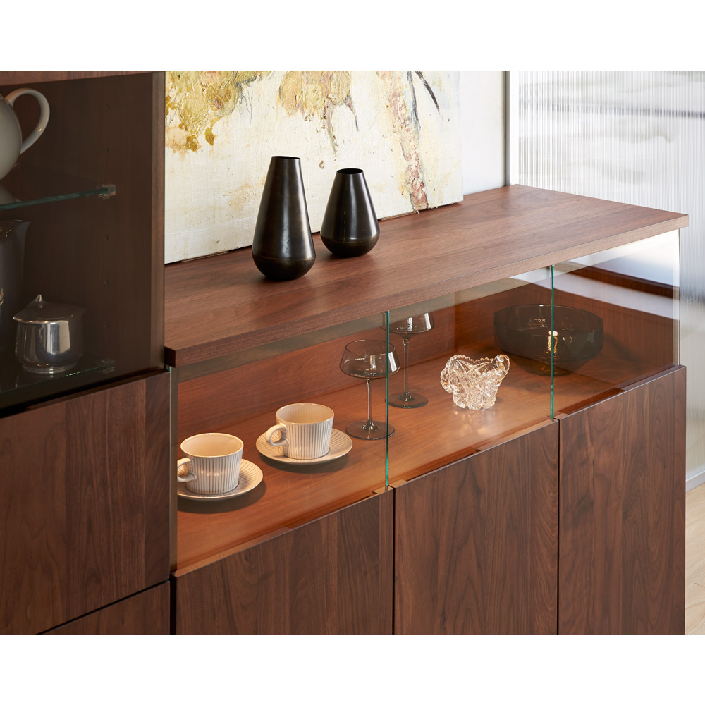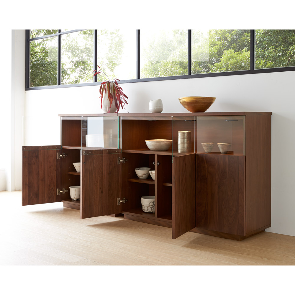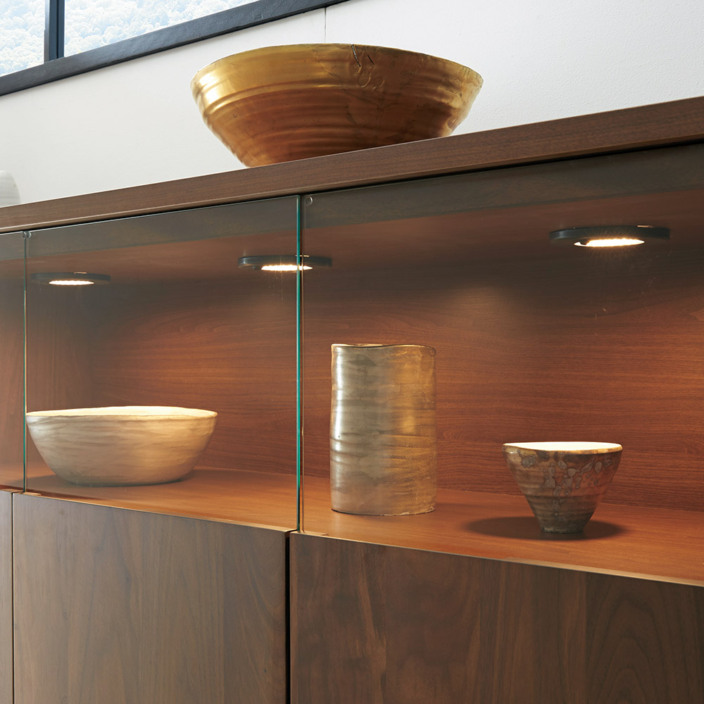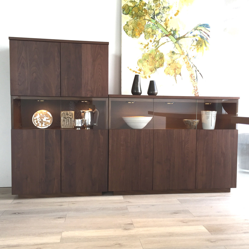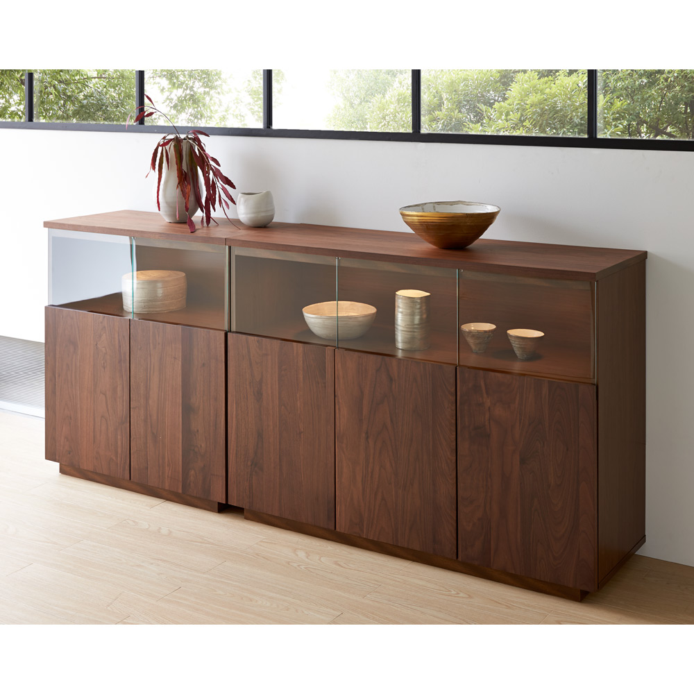 大切なコレクションをしまう場所にふさわしい重厚感。コレクションが引き立つ、LEDダウンライト付きのリビングボードです。