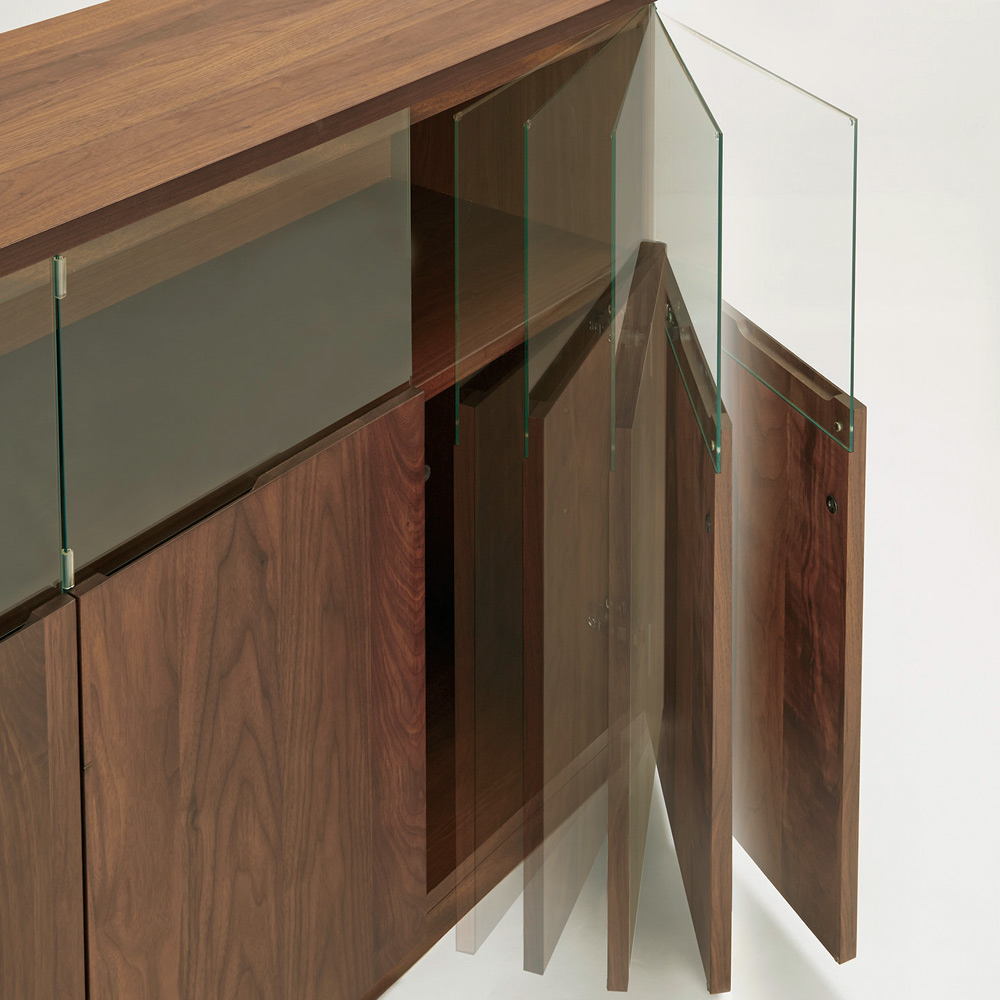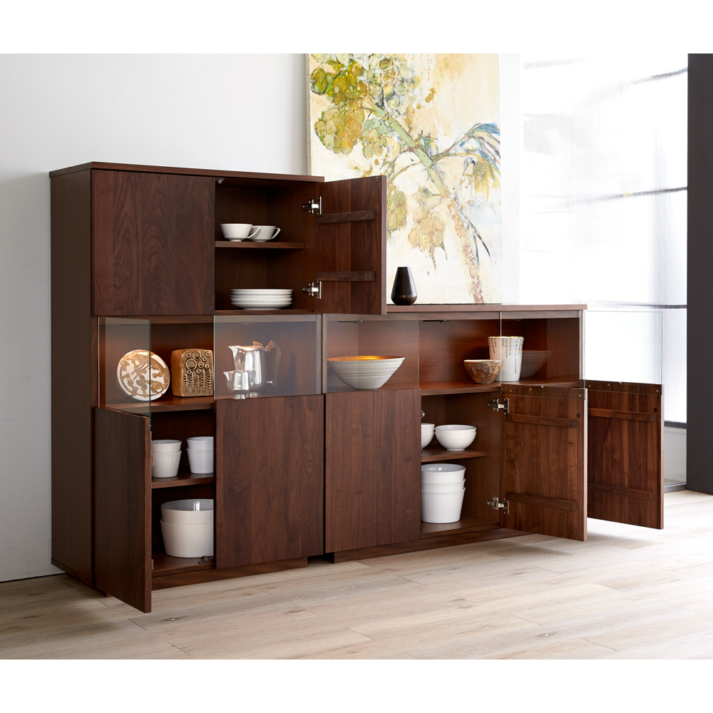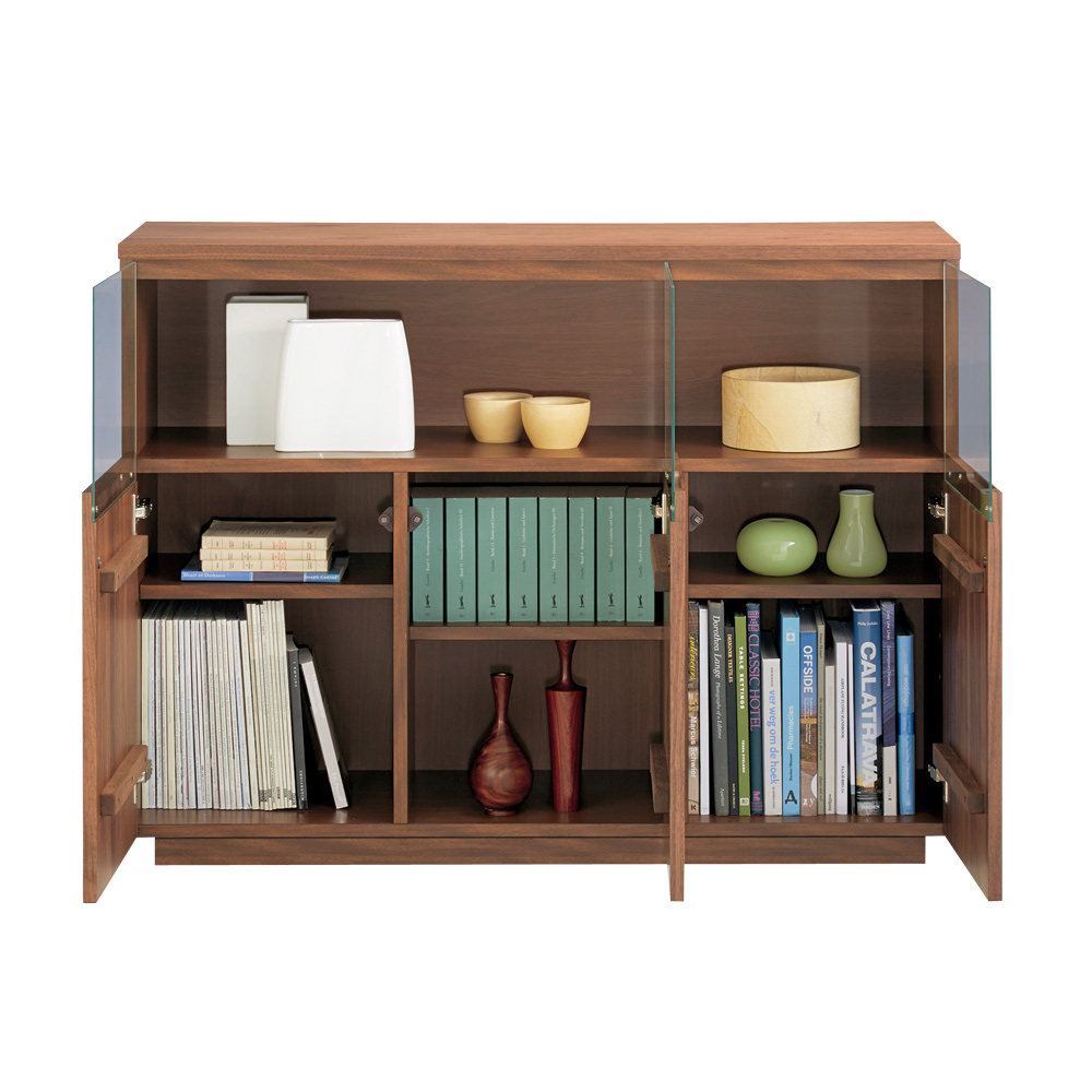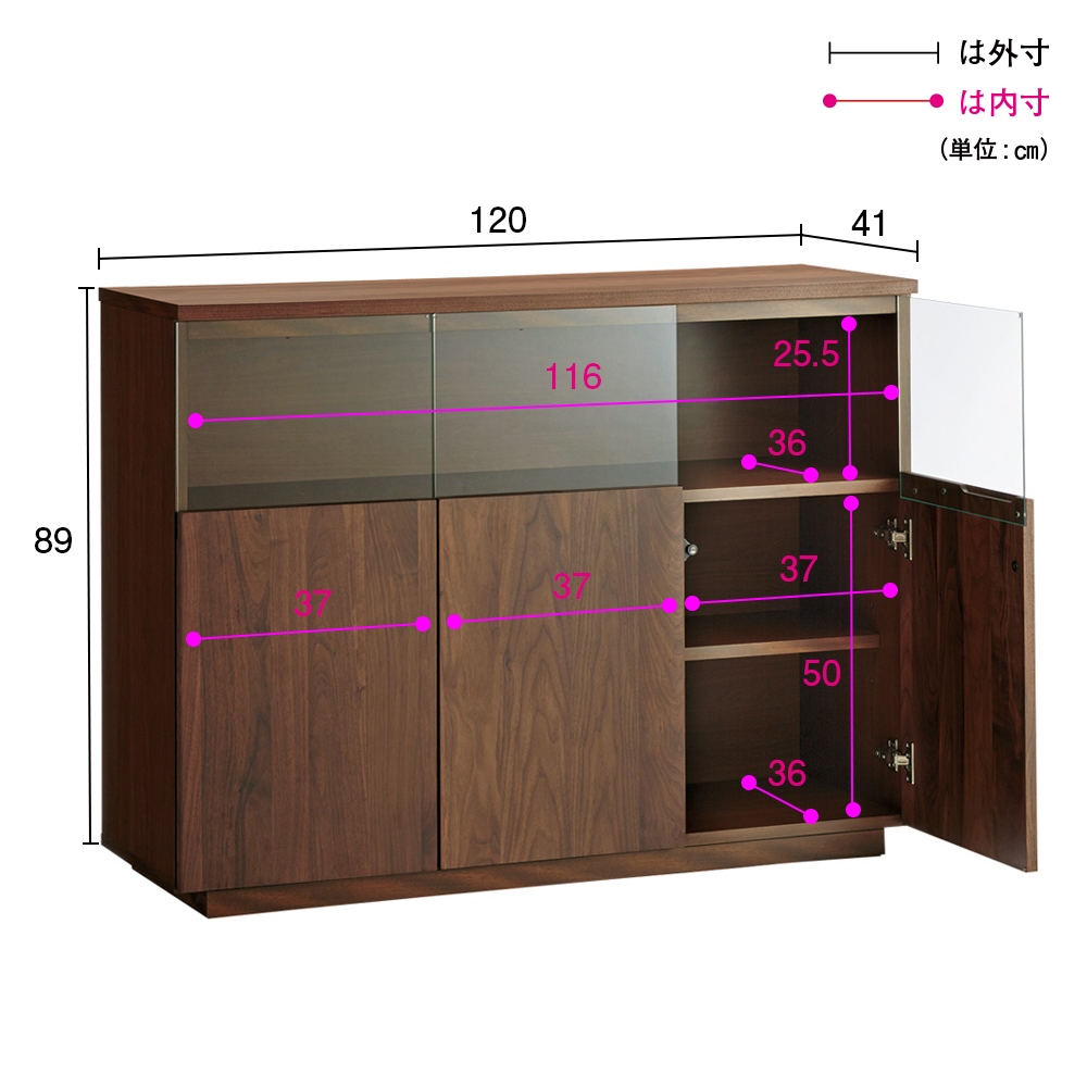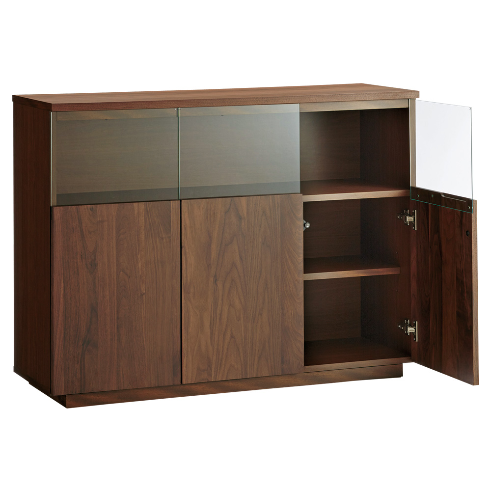 ■前面…ウォルナット天然木(ウレタン塗装)、天板…ウォルナット化粧合板(ウレタン塗装)、側面…化粧合板、ガラス扉…4mm厚強化ガラス