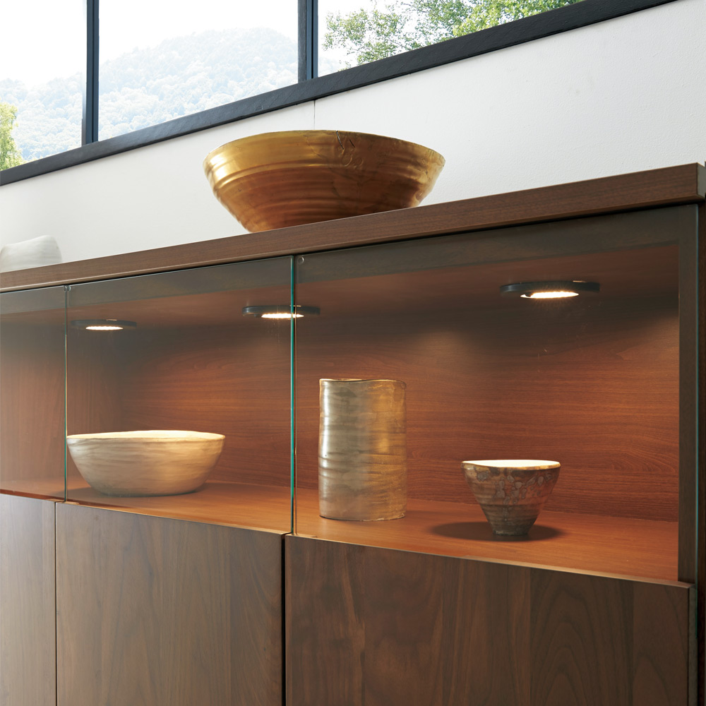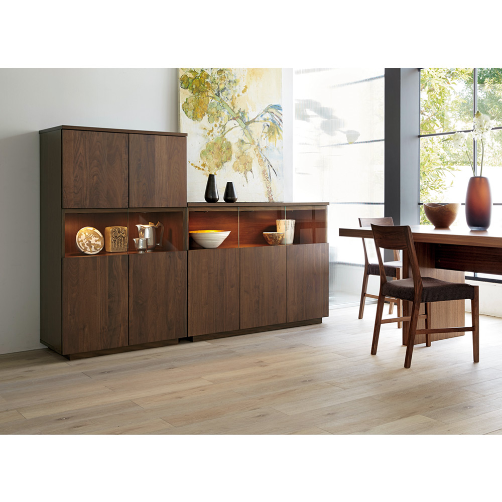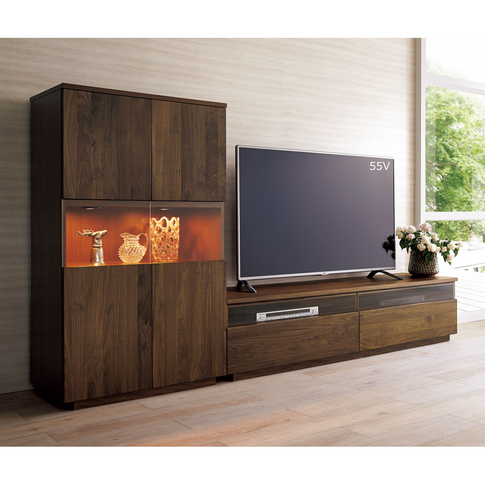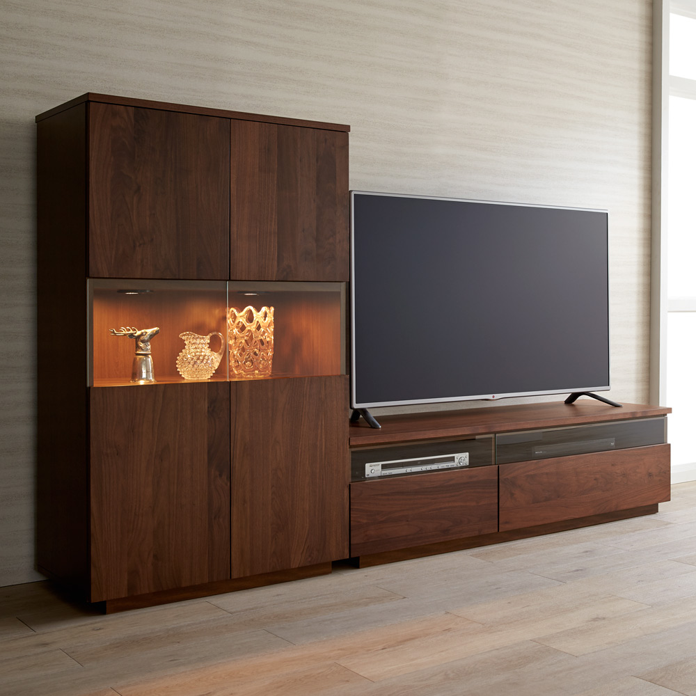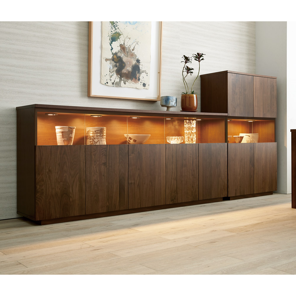 大切なコレクションをしまう場所にふさわしい重厚感。コレクションが引き立つ、LEDダウンライト付きのリビングボードです。