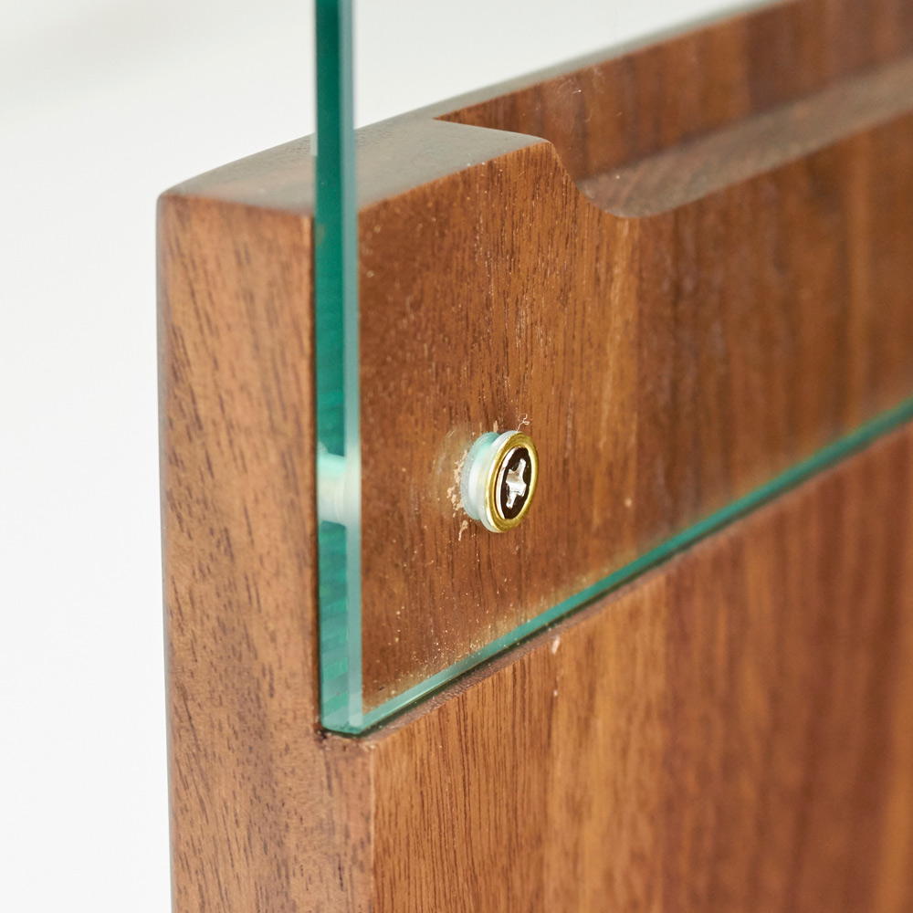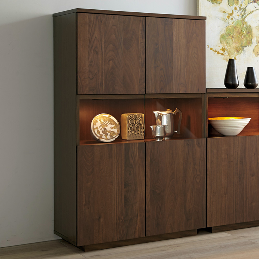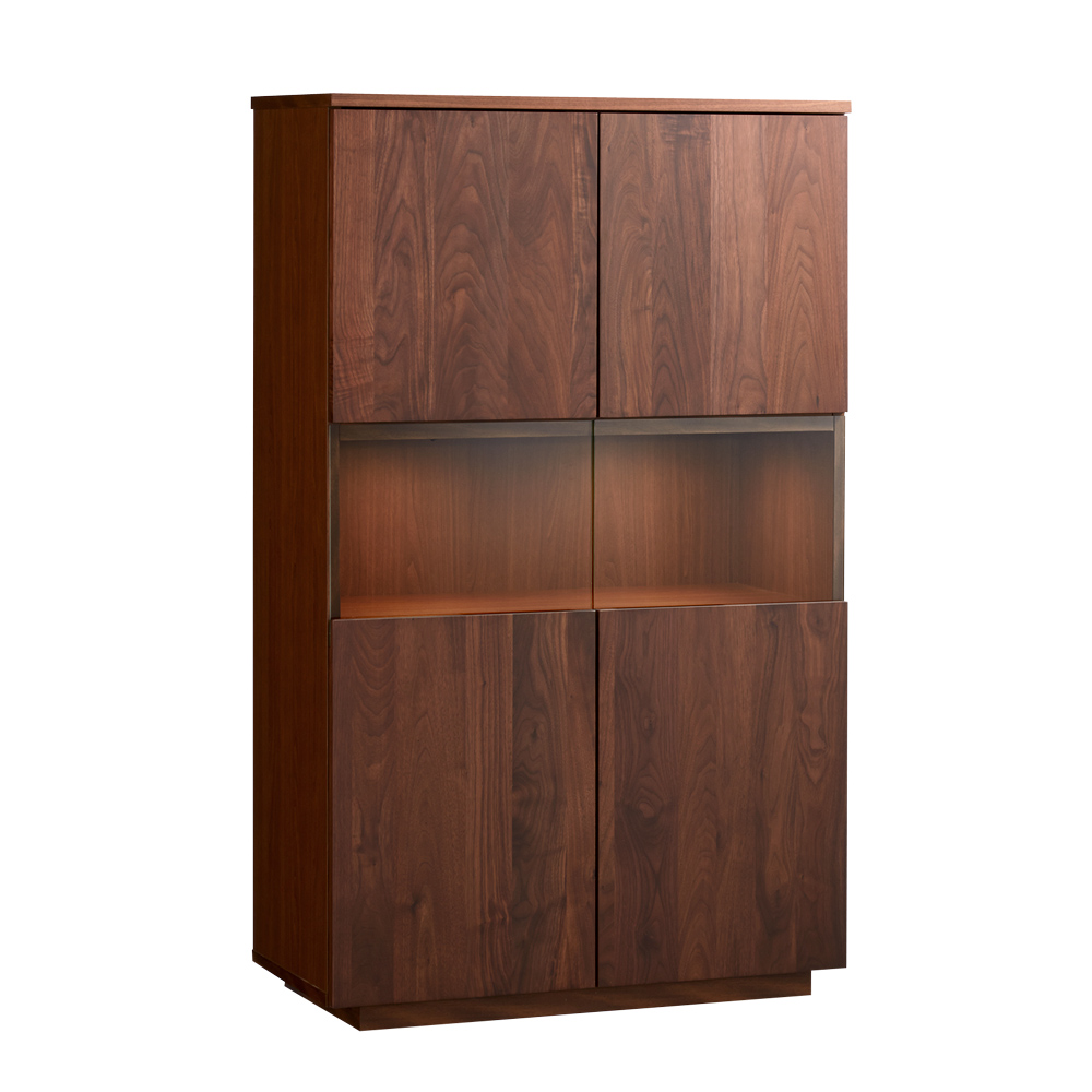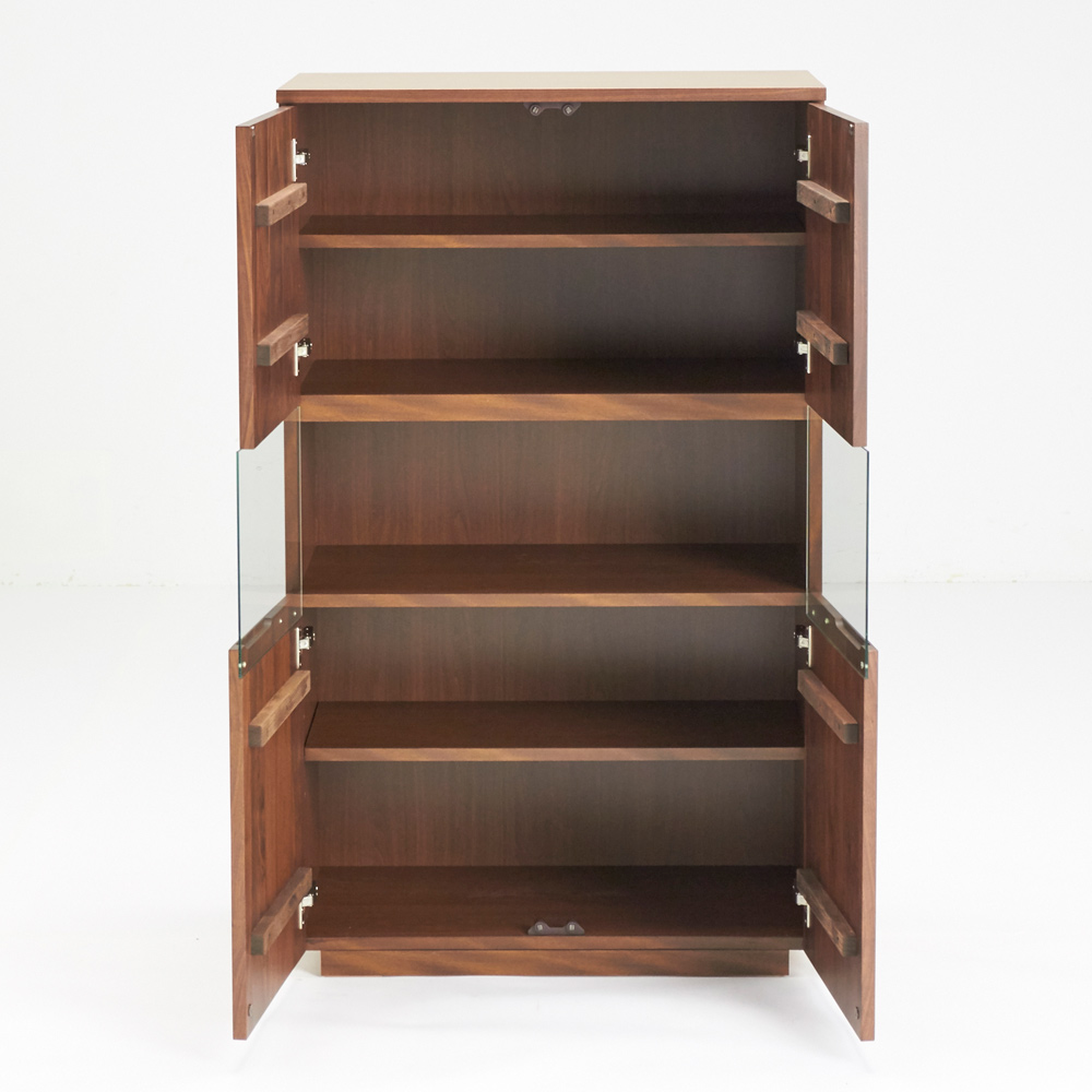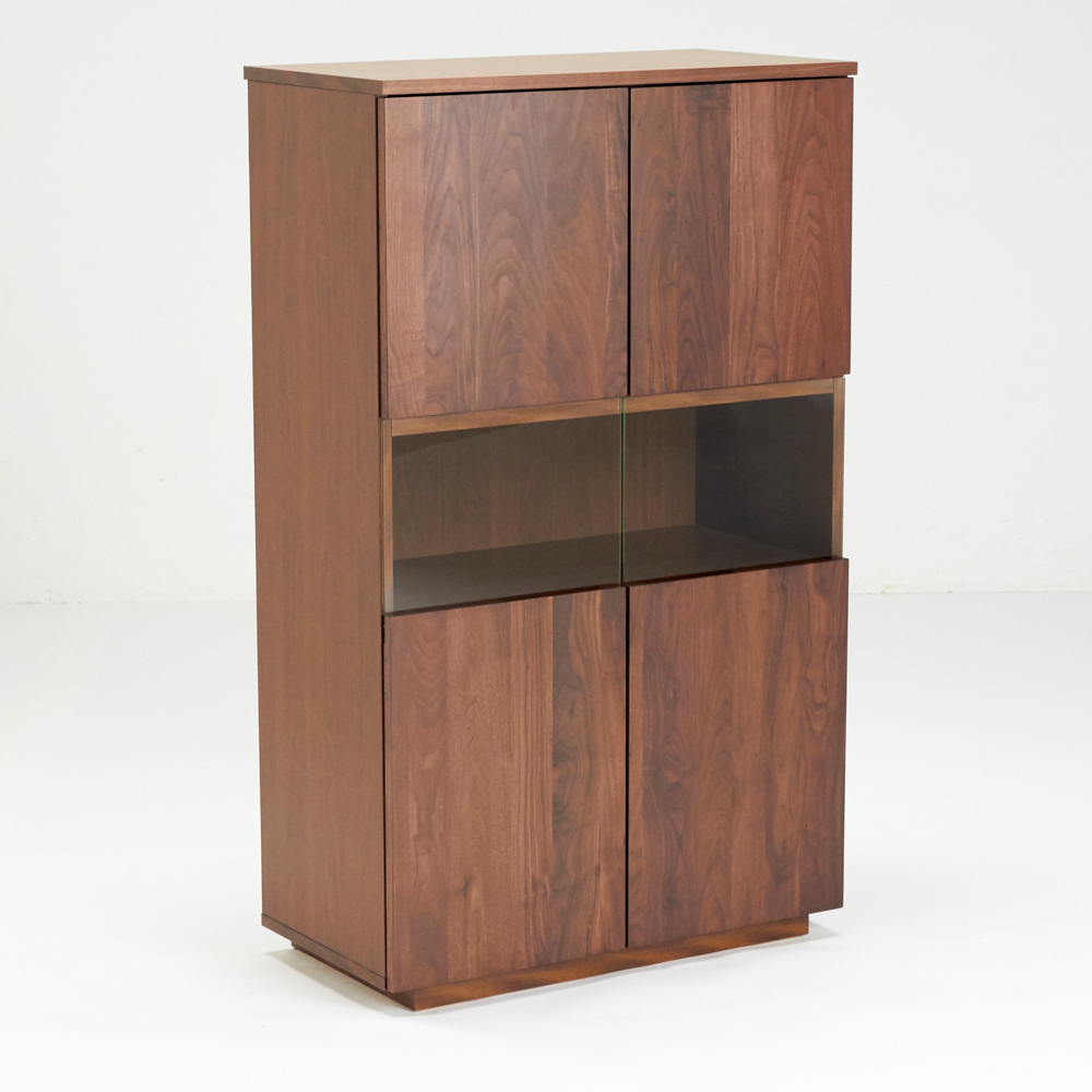 ■前面…ウォルナット天然木(ウレタン塗装)、天板…ウォルナット化粧合板(ウレタン塗装)、側面…化粧合板、ガラス扉…4mm厚強化ガラス