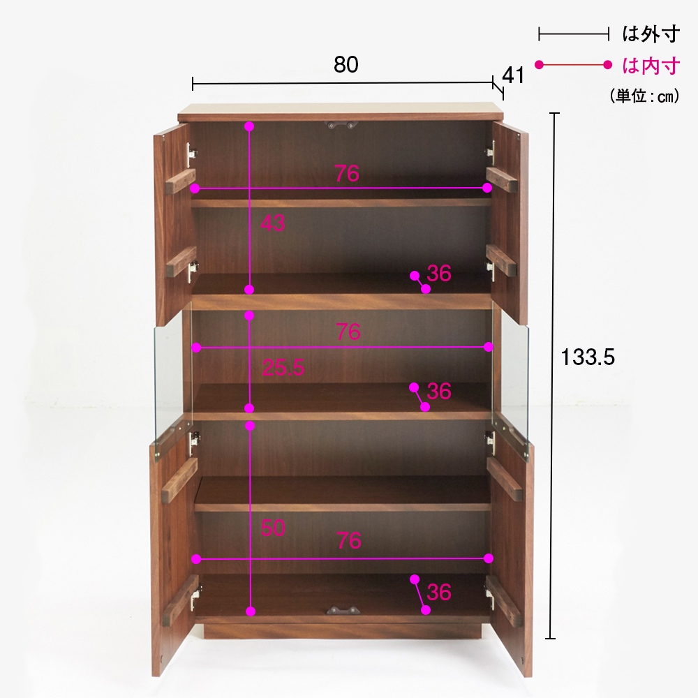 ■サイズ:幅80奥行41高さ133.5cm、ディスプレイ収納部有効内寸幅76奥行36高さ25cm