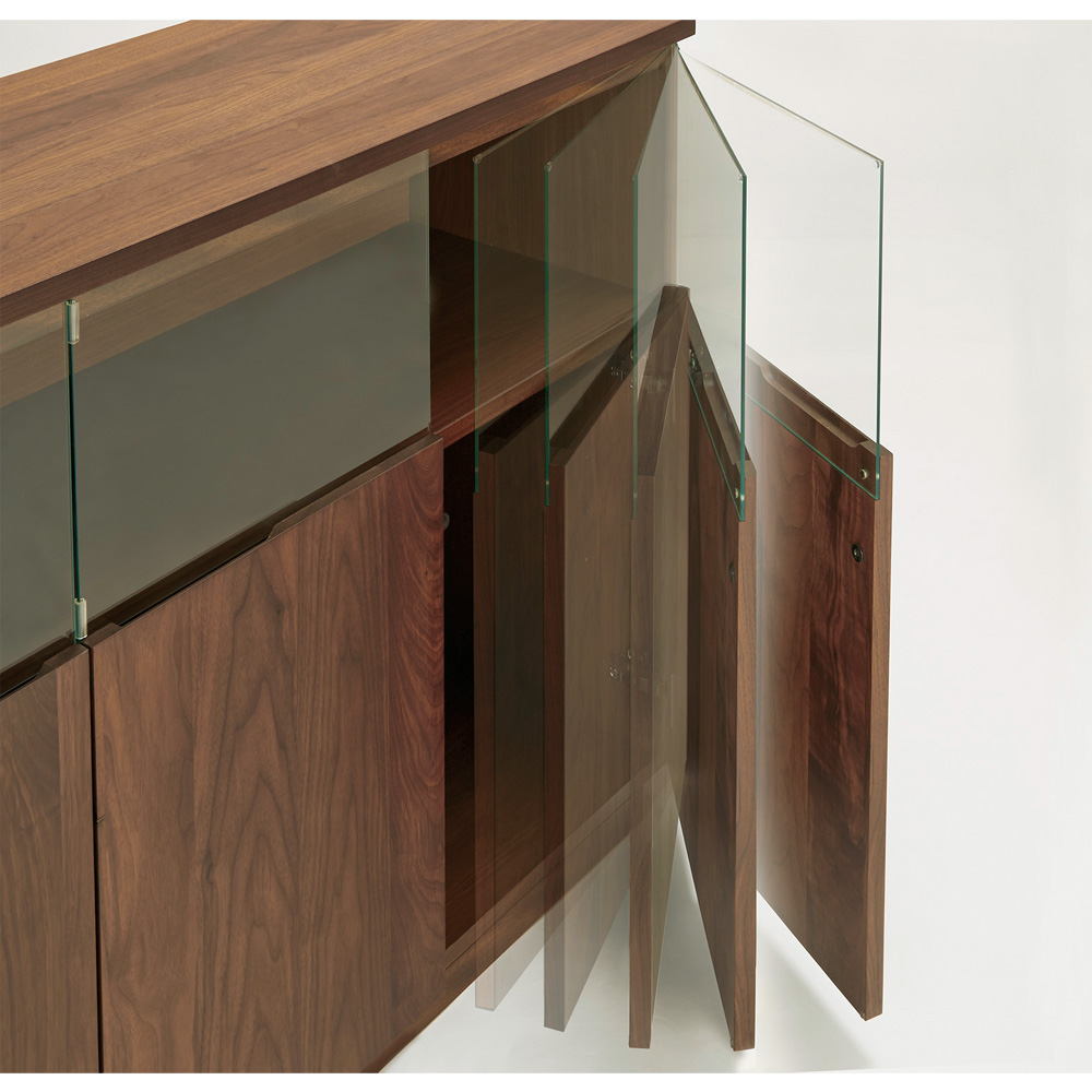 ガラス付き扉は静かにゆっくり閉まるソフトクロージング仕様です。※写真はシリーズのサイドボードです。