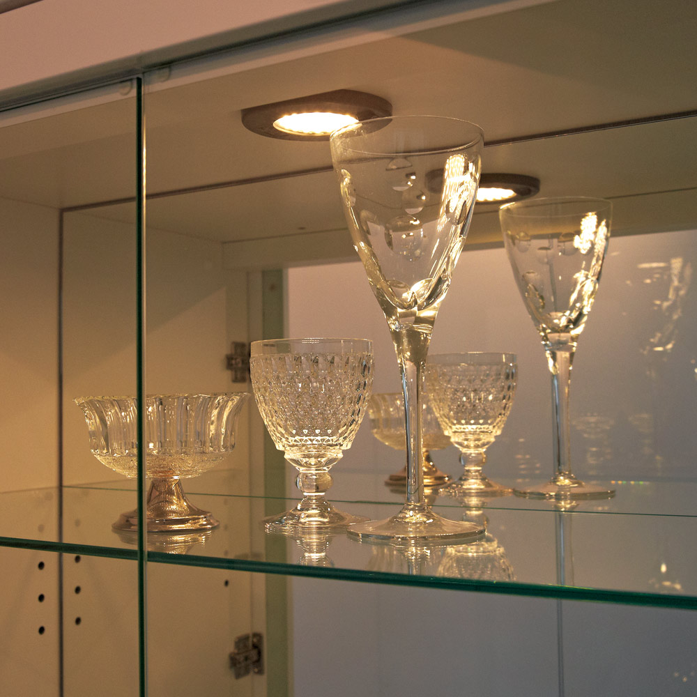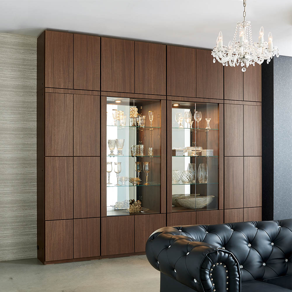 省エネ&長寿命のLEDライトを採用したダウンライトが、自慢のコレクションを美しく演出。さらに、背面のミラーにライトが反射することでラグジュアリーな輝きがいっそう増し、自分だけのミュージアムのような収納を実現します。