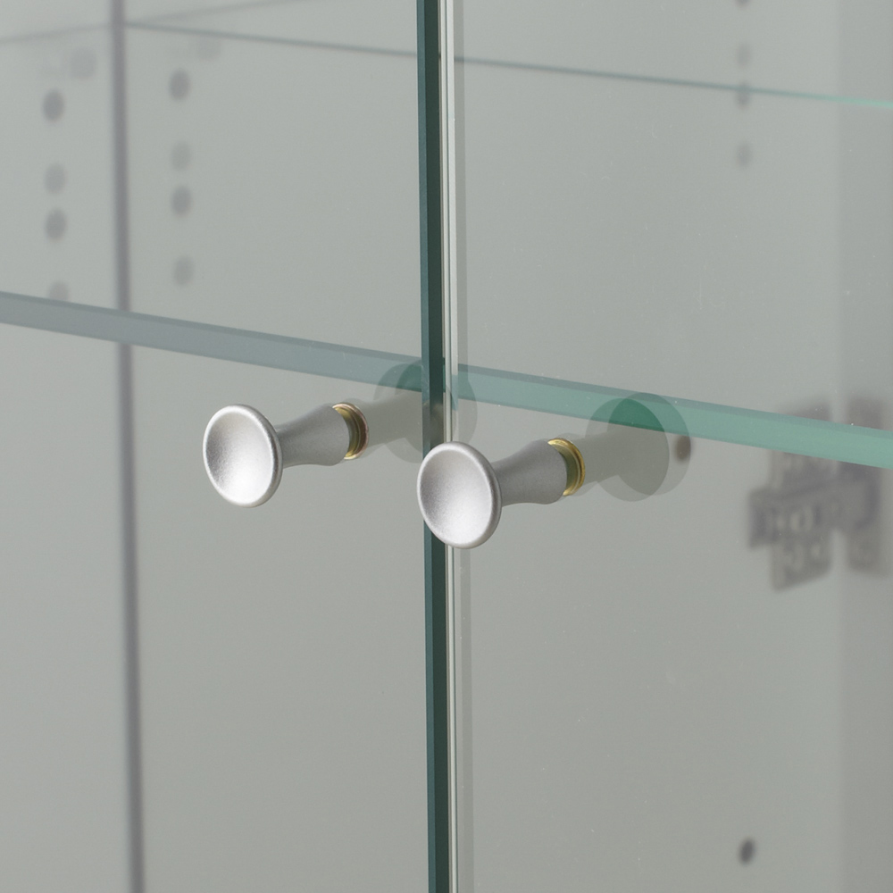 ガラス棚は簡単に可動 3cmピッチで調節可能で、さまざまな形状のものを飾れます。