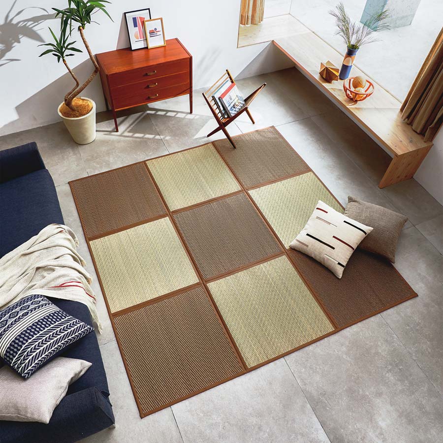 「い草は使ってみたいけどオフシーズンの収納場所が気になって・・・」そんな方におすすめの折りたためるい草ラグです。不織布を裏面に貼っているためボリュームもあり、厚さは、約5mmの裏付きタイプと、約9mmの厚手裏付きのタイプが選べます。
