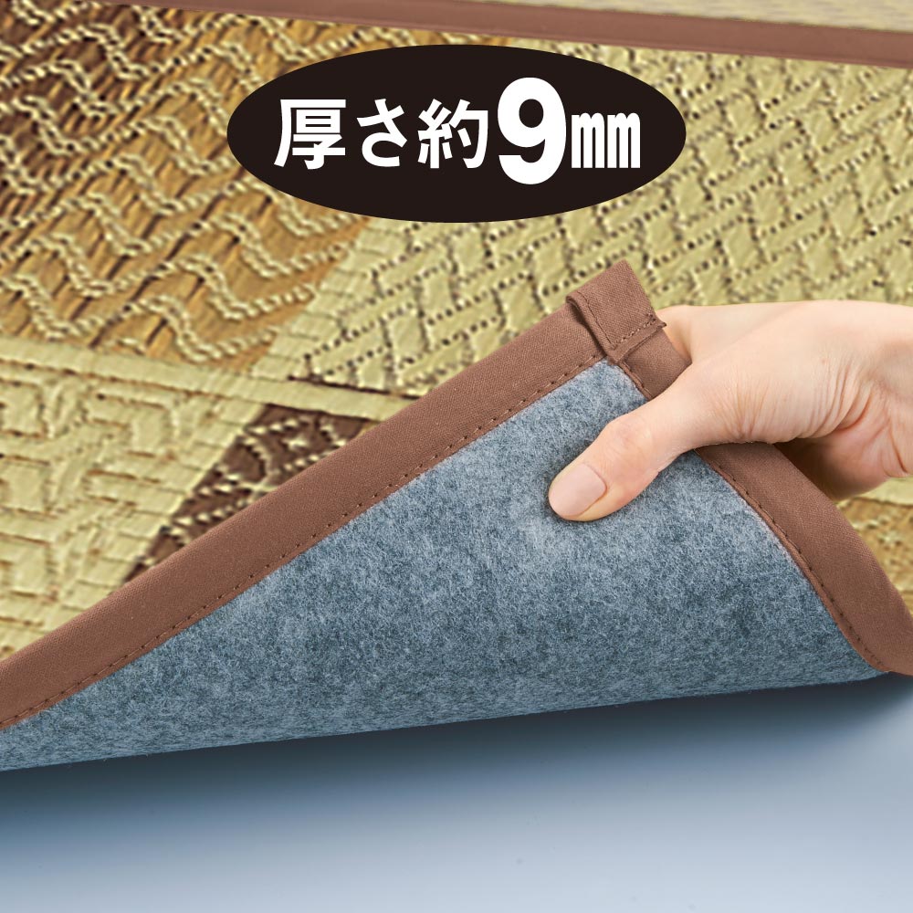 「い草は使ってみたいけどオフシーズンの収納場所が気になって・・・」そんな方におすすめの折りたためるい草ラグです。不織布を裏面に貼っているためボリュームもあり、厚さは、約5mmの裏付きタイプと、約9mmの厚手裏付きのタイプが選べます。