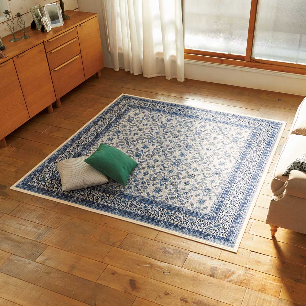 一枚で空間をぐんとリッチにしてくれる繊細な柄と目の細かさ。抗菌防臭加工済みで丸洗いもでき、厚さ約3mmと薄手なので使わない時はたたんで収納もできます。